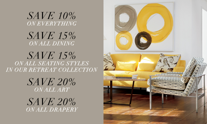 Includes all drapery, drapery fabric (in-store only), drapery hardware, wallcoverings (in-store only), artwork and mirrors.