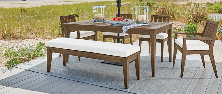 Our outdoor dining tables and chairs are designed for mixing and matching; for example, the teak elements of our Bridgewater Cove outdoor dining table and our Marteena outdoor dining side chairs make them feel coordinated, while Marteena’s woven strap seat and back adds textural contrast.