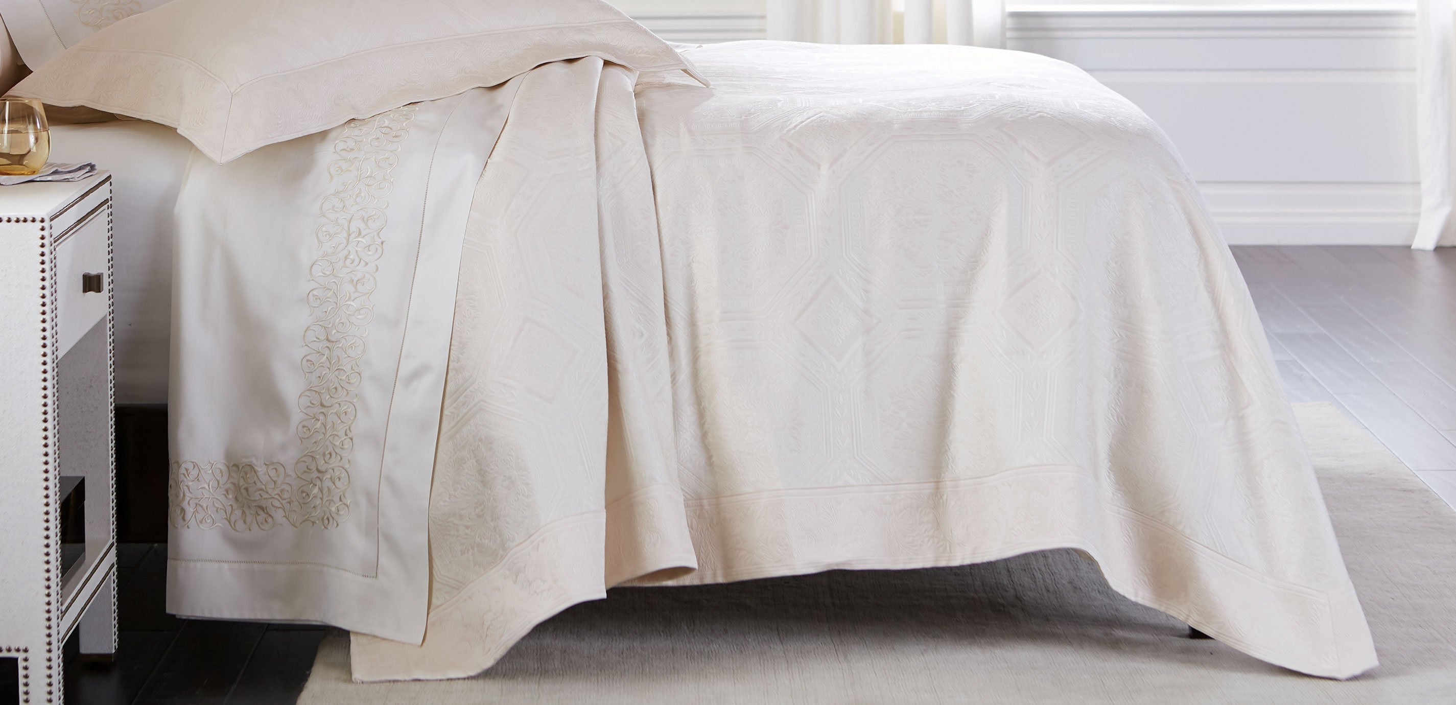 - Vintage-inspired, classically styled matelassé bedcovering in a soft ecru color. Finished with a coordinating 5" border; angled corners at the bottom of the coverlet.