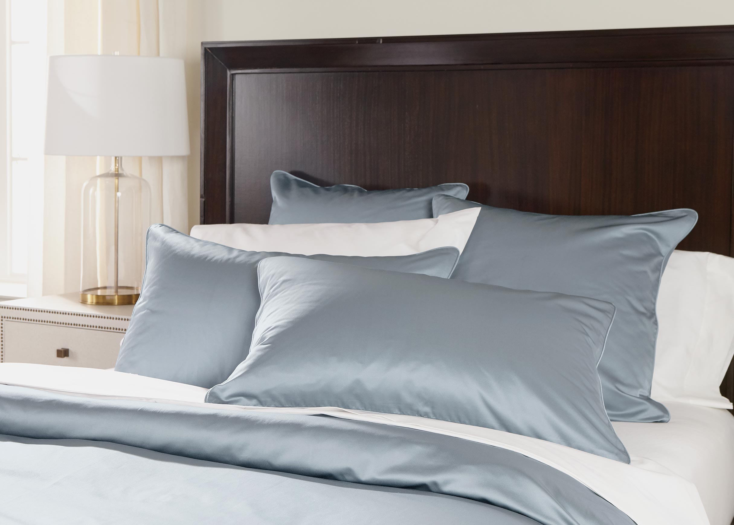 - Stunning yet simple solid mist blue sham, with subtle sheen and classic design. Reverses to solid, coordinating cotton. Sham features a self-welt on all four sides and envelope closure.