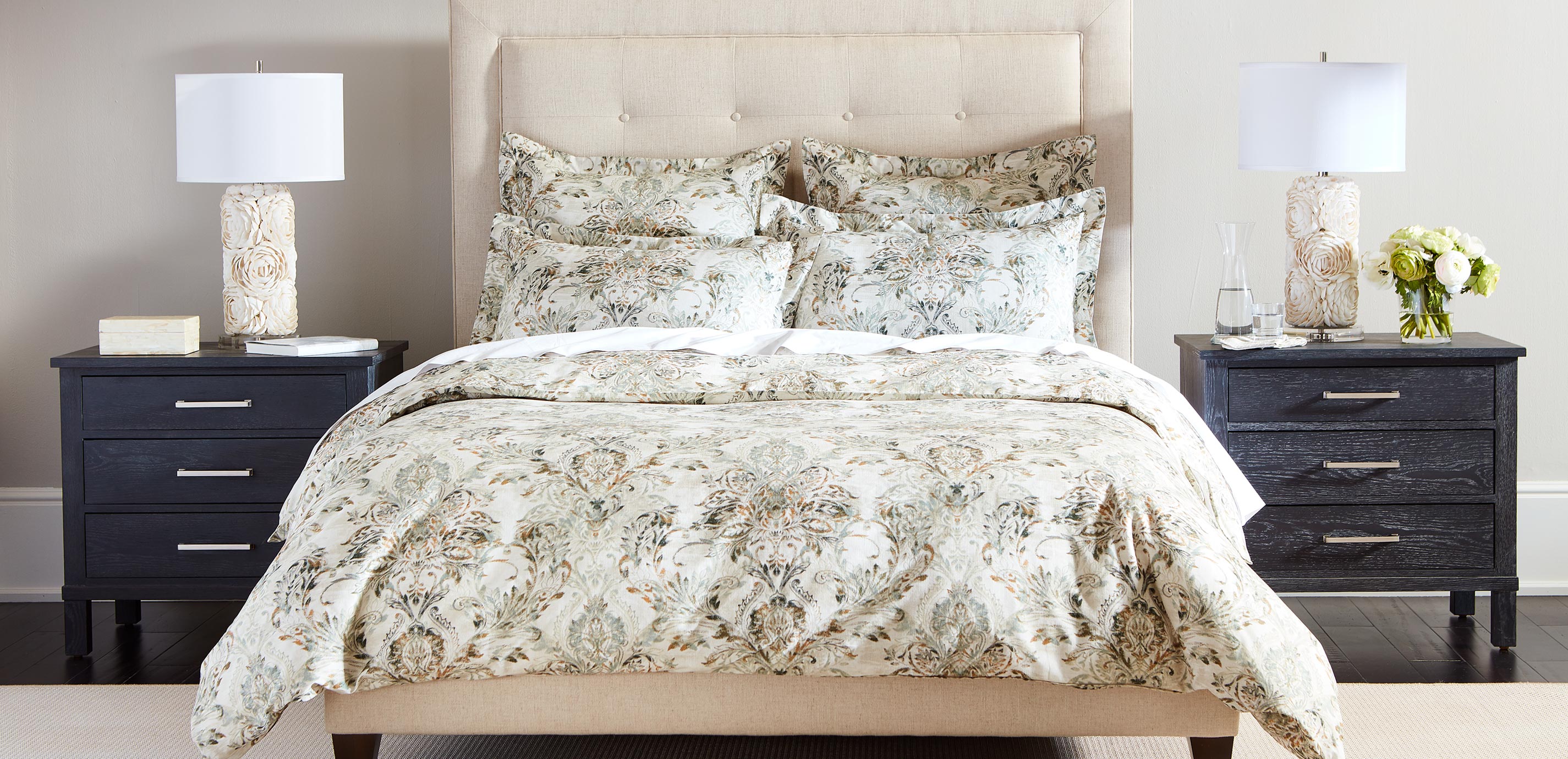 Transform your sanctuary into a Tuscan villa with our Travale duvet cover and shams; the large-scale pattern, an homage to vintage block prints, features vibrant pops of cypress green and honey gold. The textured ground—the hand is linen-like, but the composition is 100% easy-care cotton—suggests tea stain and stucco. A beautifully detailed work of art.