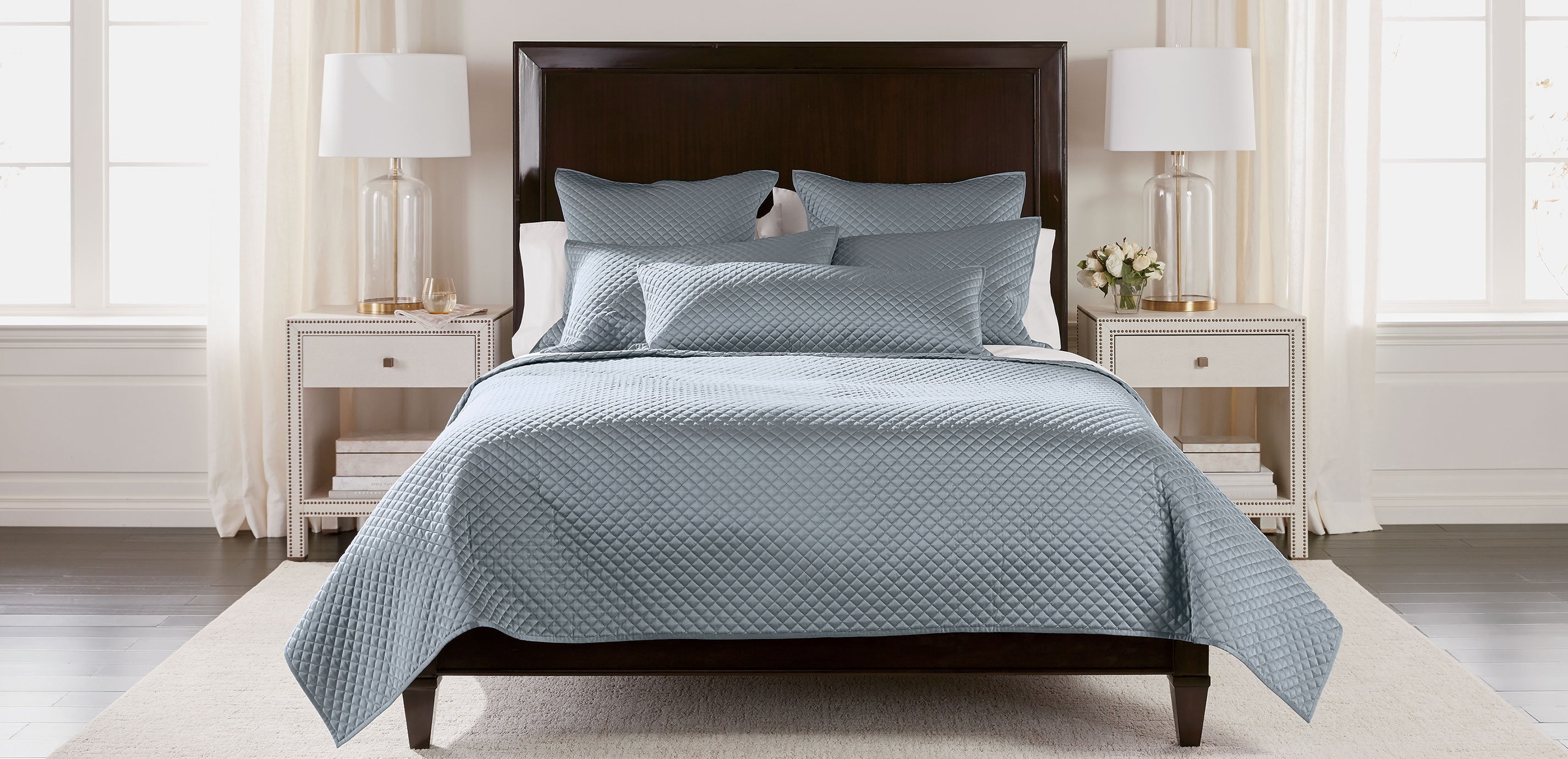 A small-scale diamond quilt pattern stitched on a lustrous, solid ground makes our Salena mist blue quilted coverlet and shams a classic choice, no matter your style. Lightweight and undeniably luxurious, the Salena bedding ensemble is timeless, proving diamonds are forever.