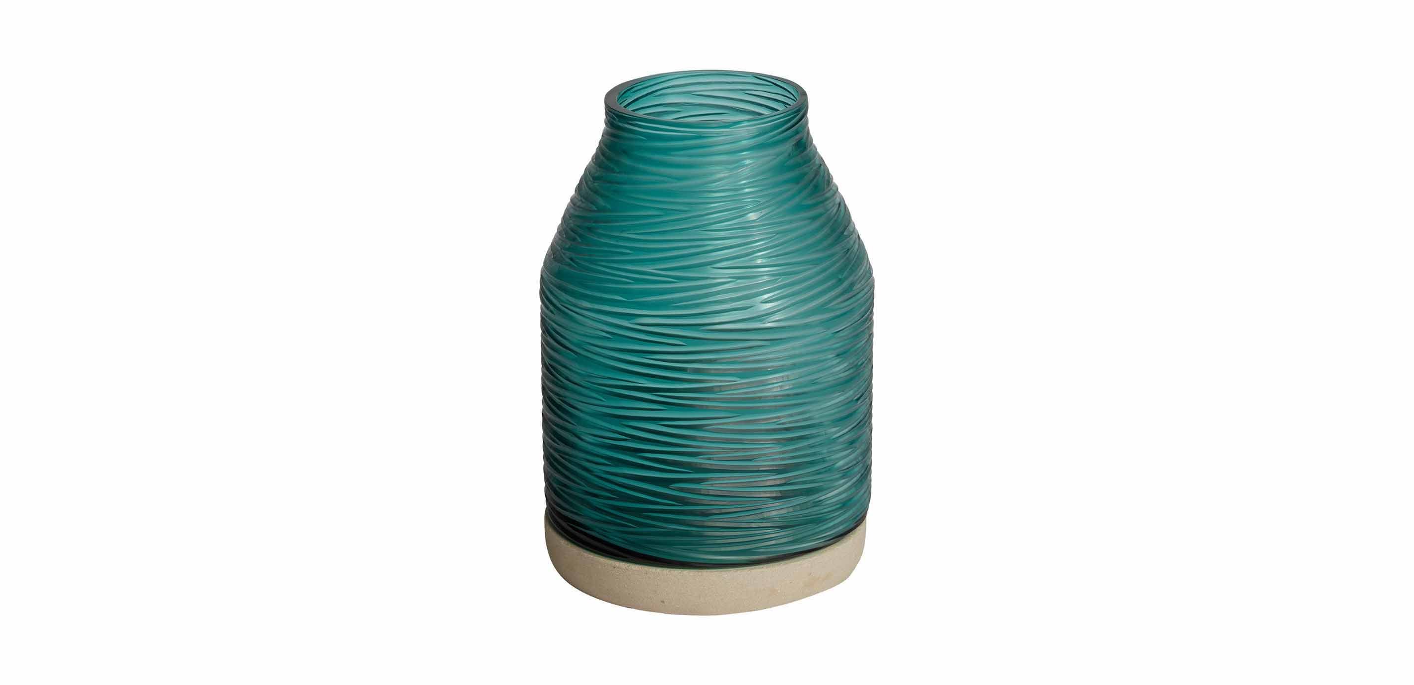 Handcrafted from mouth-blown recycled glass in a color we absolutely adore, Divina represents fragility and strength, the sharp and the delicate. The pattern that embraces each Divina glass hurricane vase is carved by hand, a guarantee that each one you order will be an original. Divina rests atop a sandstone base (a beautiful symmetry, as sandstone is a material commonly used in glass-making); it's safe for holding both water and candles. Also looks gorgeous alongside our Adara cut glass hurricanes.