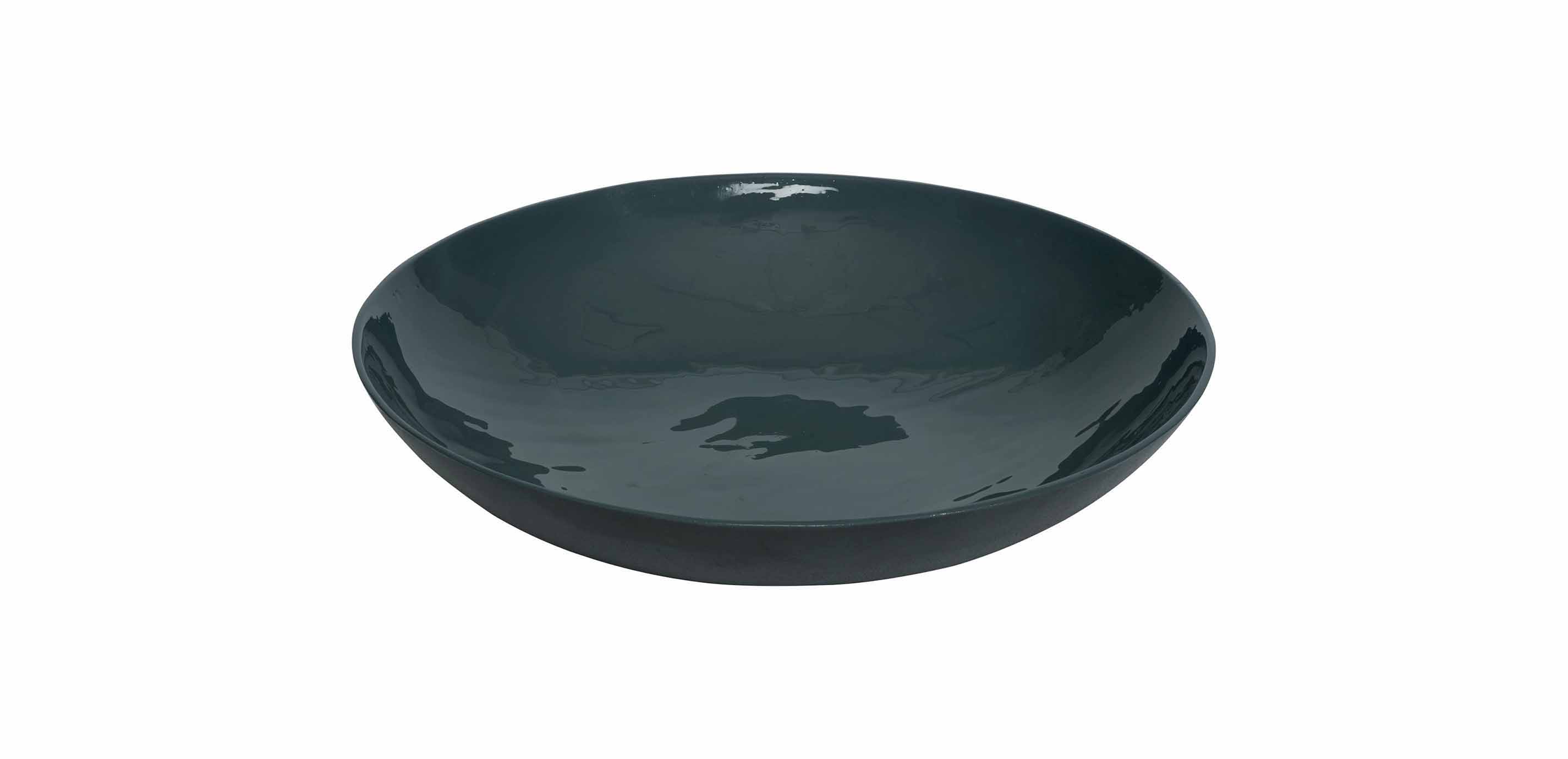 Our Reza lacquered bowl mixes materials in the best possible way: unexpectedly. Each decorative bowl is made from sand-casted aluminum, with a textured, sand-like exterior in a rich charcoal hue. The interior is smoothed out and coated with an enamel-like material that fills it with rich color. (The 18-inch bowl is available in dark teal; the 14-inch bowl in a dusty purple.) After enameling, layers of lacquer are applied for the ultimate in luster, a process that adds a sense of depth to the sleek bowl.