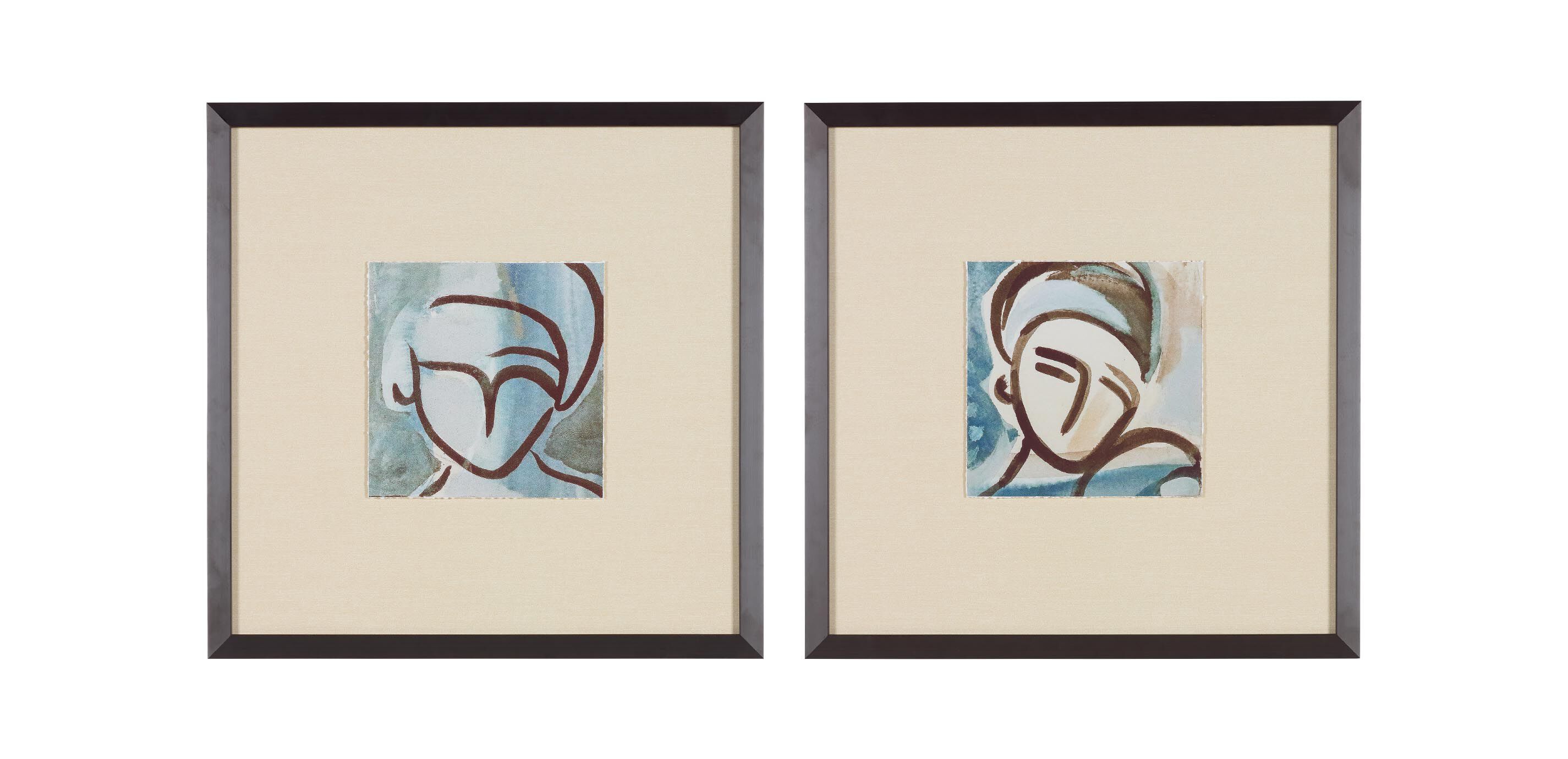Modern, abstract figure artwork in bold, contemporary hues like glass and rust—Small Gestures exudes modern sophistication. A delicate blend of soothing blues and rich browns is framed in a refined espresso frame and set against an earthy fabric mat.