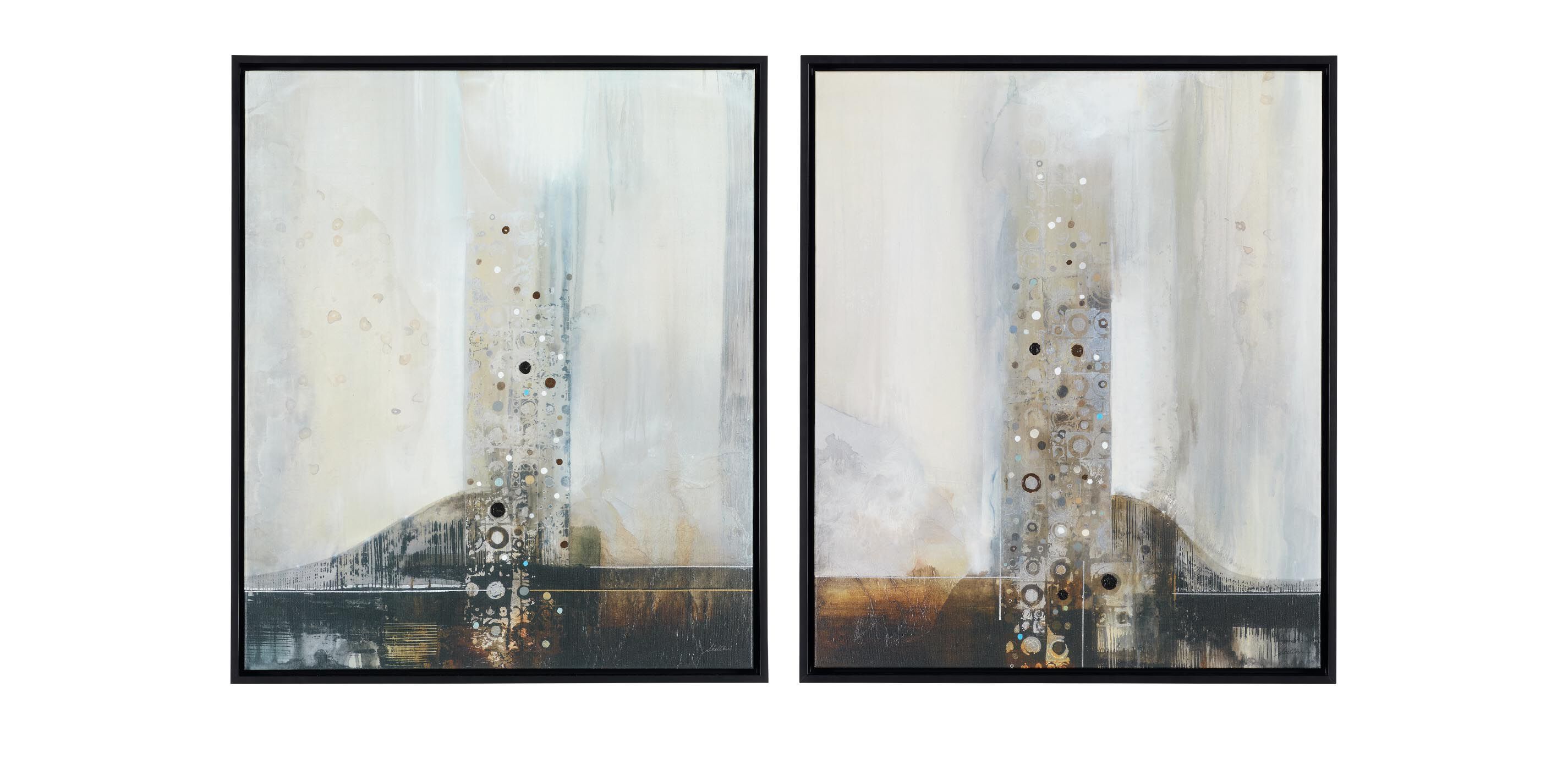 • Floated in a solid wood frame with a black finish