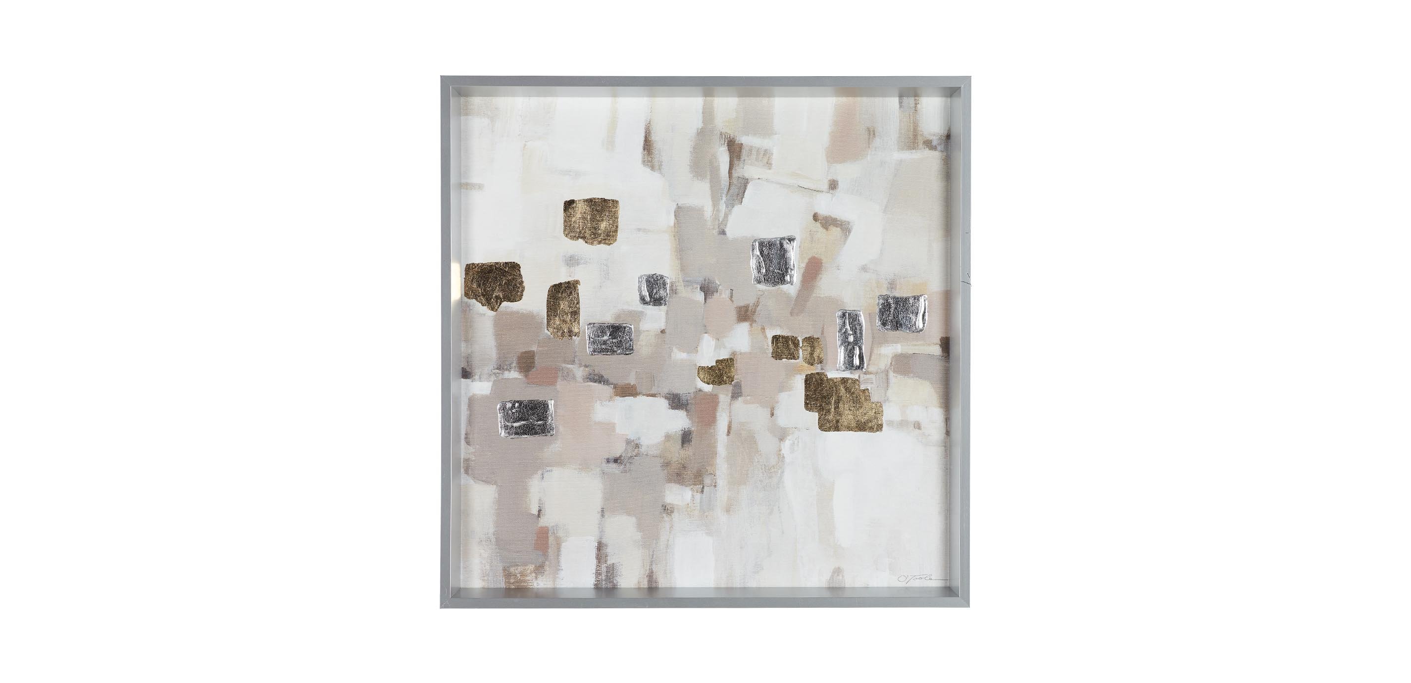 Like a view of the city through fog and rain-speckled glass. A neutral palette draws the eye in—you can almost make out the buildings in the distance—while speckles of gold and silver leaf evoke distant twinkling lights along the skyline.