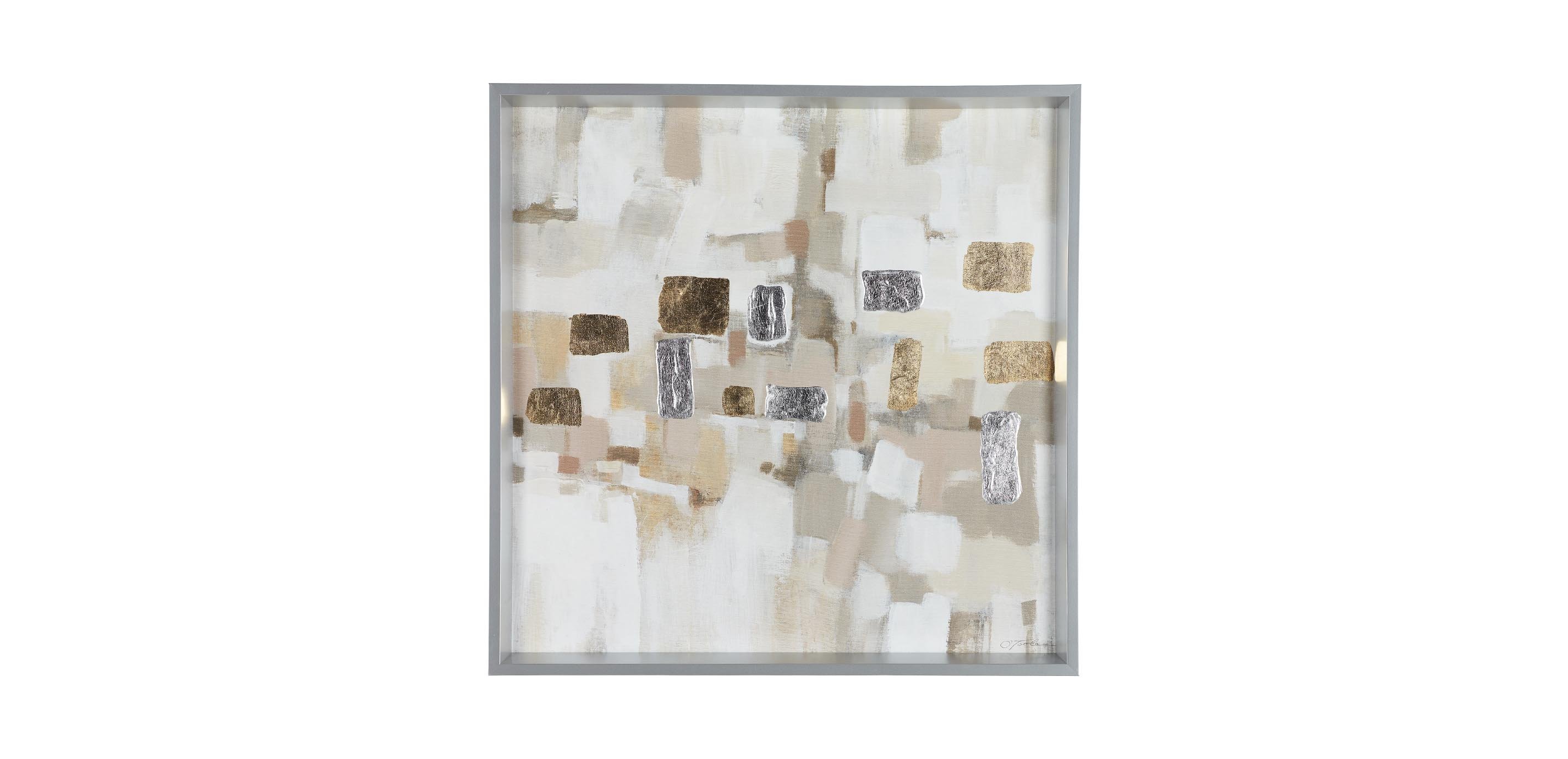 Like a view of the city through fog and rain-speckled glass. A neutral palette draws the eye in—you can almost make out the buildings in the distance—while speckles of gold and silver leaf evoke distant twinkling lights along the skyline.