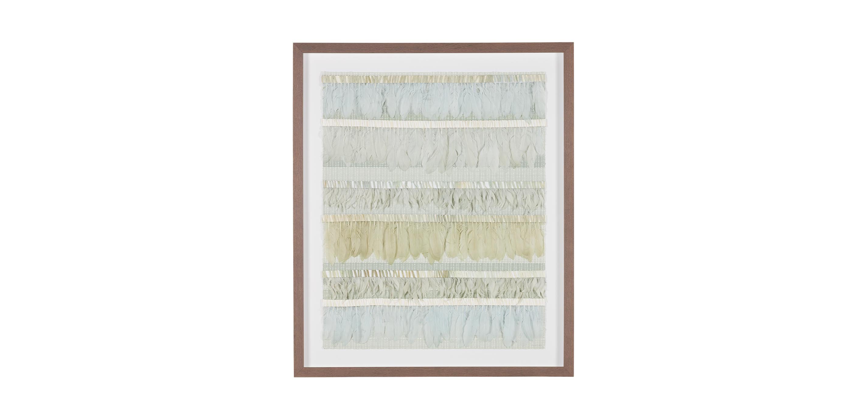 One piece is gorgeous; the series of three is showstopping. Californian artist Dawn Wolfe creates each of these handcrafted pieces that are inspired by the migratory birds that visit her almond orchard every year. Goose feathers are attached to painstakingly hand-wrapped strips, each hand-dyed using natural pigments, then set in rows against a deckle-edge watercolor background.
