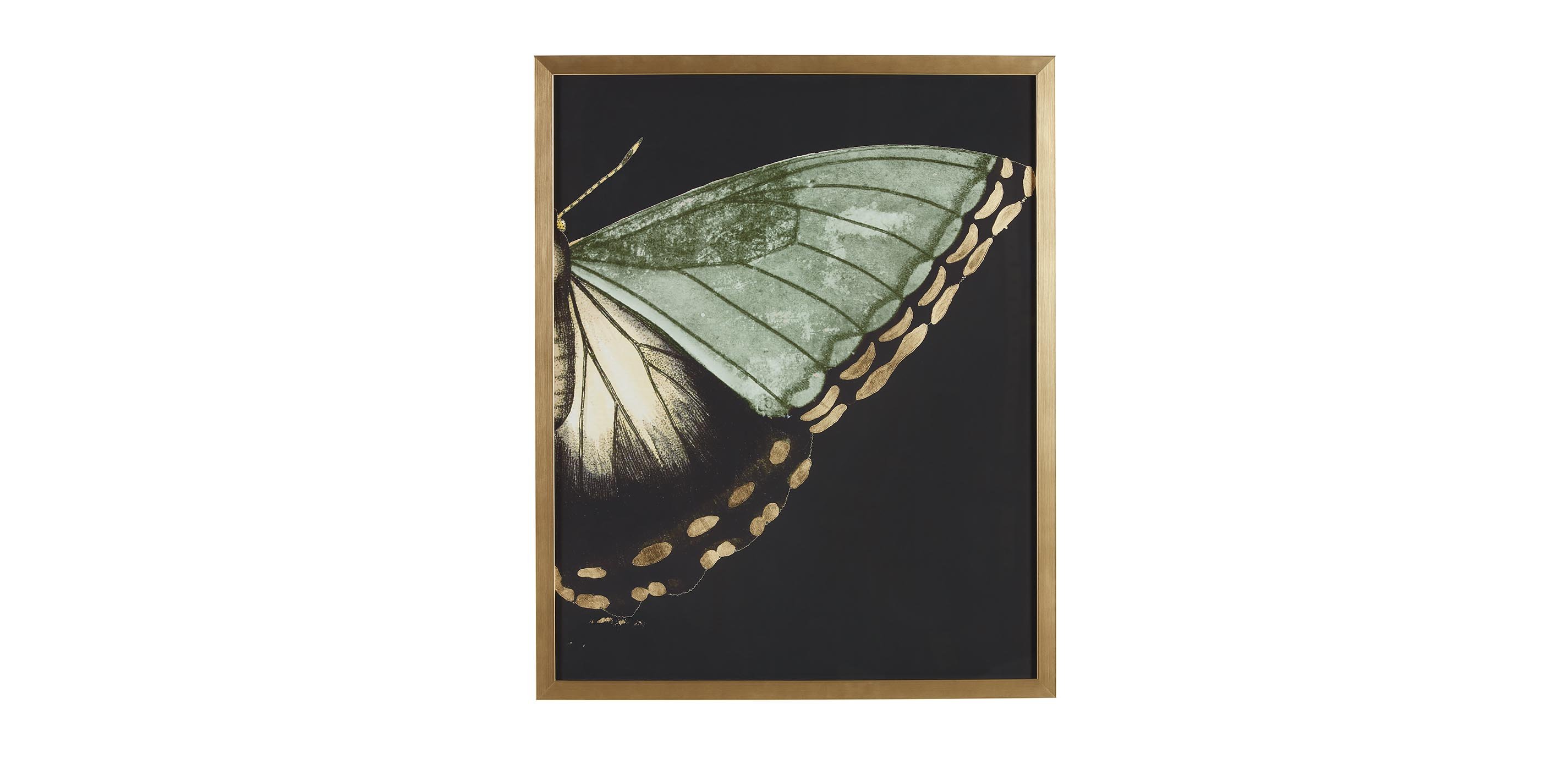 This pair of butterfly wings instantly creates balance in any room, thanks to the wings' delicate angles and natural symmetry. Hues of emerald and smoke look stunning paired with hand-applied gold leaf details and a black background, while thoughtfully placed shadows create a photorealistic look. These wings look even better hung in a pair.