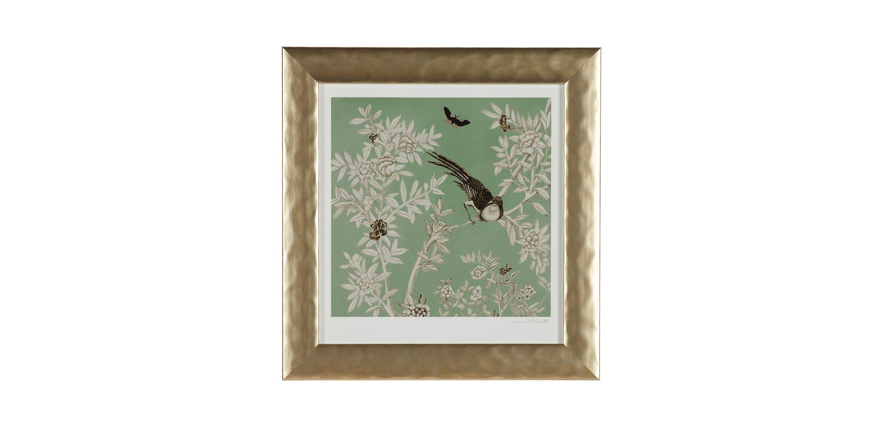 Each chinoiserie-inspired print in this series evokes ancient Chinese decorative designs but adds some modern, softer, more elegant twists. Traditional blues have been replaced with a gentle shade of mint green, and gold leaf accents have been applied by hand to the flowers.