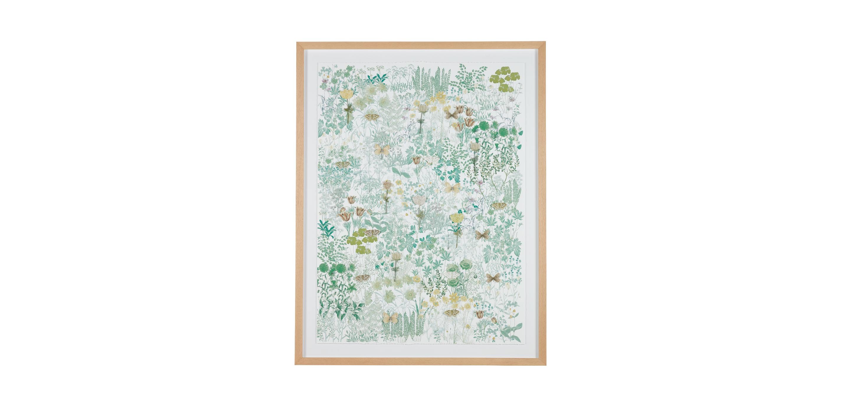 This forever-spring meadow by artist Dawn Wolfe was originally comprised of individual 18th- and 19th-century botanical prints, which were part of her extensive collection of European etchings. A sprinkling of hand-cut paper flowers and butterflies, along with pops of bright hand-painted colors, adds dimension to all things bright and beautiful.