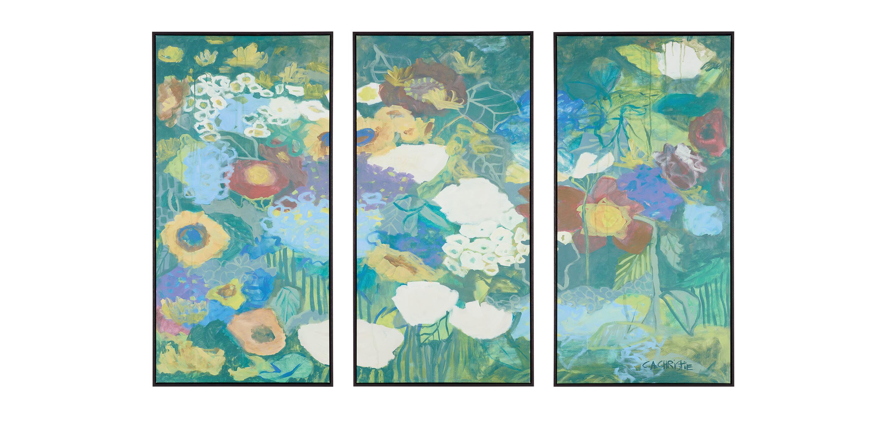 Flower Medley is a stunning abstract floral piece that captures the essence of blooming life in every brushstroke. Its blend of rich blues, calming greens, warm yellows, and passionate red instills a sense of joy and harmony, and the artist’s hand-applied embellishments give each petal and leaf textured depth.
