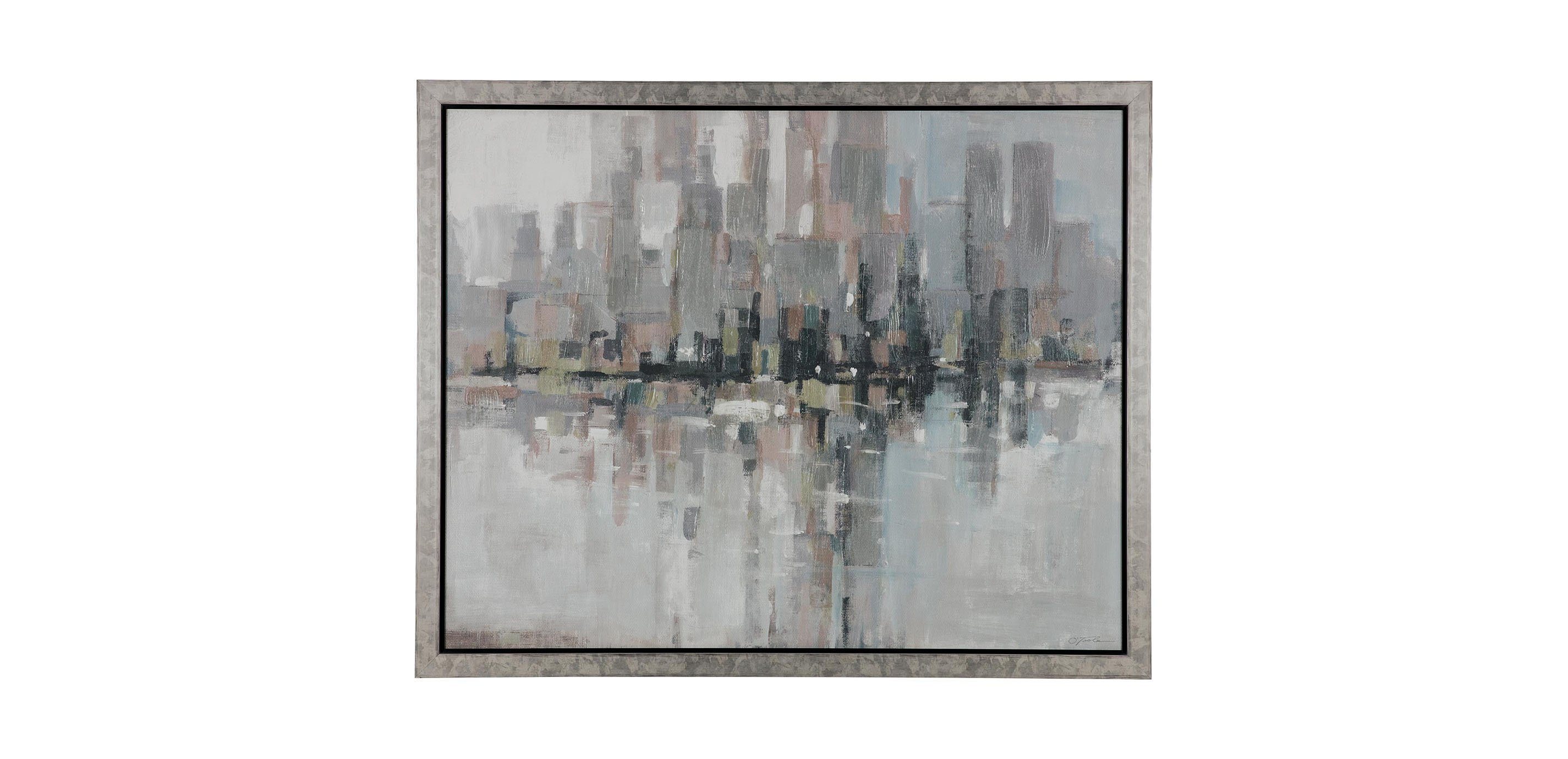 You’ll always have an amazing view of a city landscape with this large-scale artwork by Tim O’Toole. His abstract painting captures a contemporary city skyline reflecting on the water, in a rich, muted palette of charcoal grays, dusty purples, and pale blues. A giclée on canvas, this city wall art is hand-embellished for additional texture and dimension and set in a silver frame with a black fillet for a decidedly modern look.