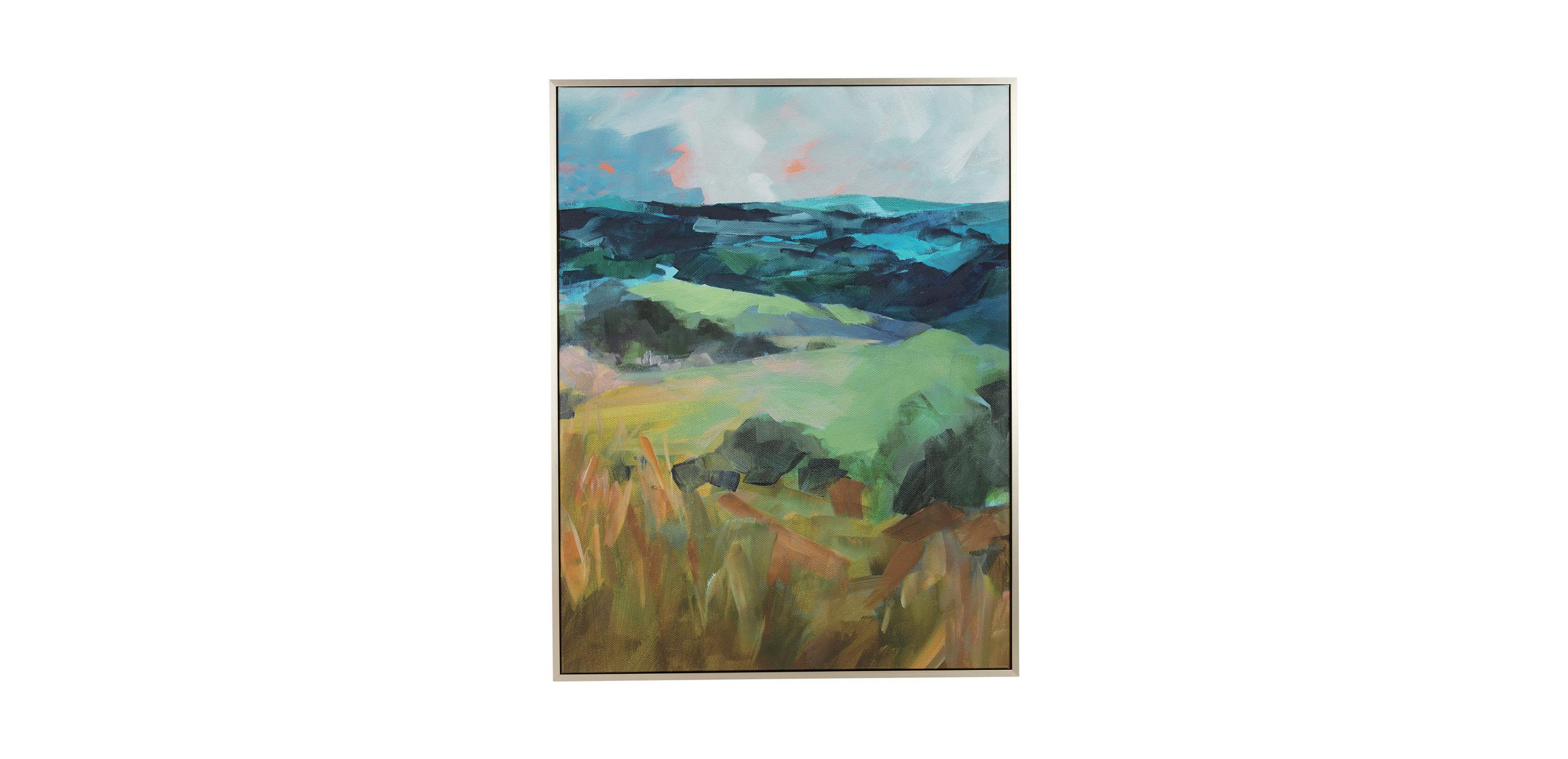 A colorful abstract landscape, where thick brushstrokes recede into a sunset-tinged background. Enhanced by the artist with paint, following the brushstrokes of the original. One of two in a series.