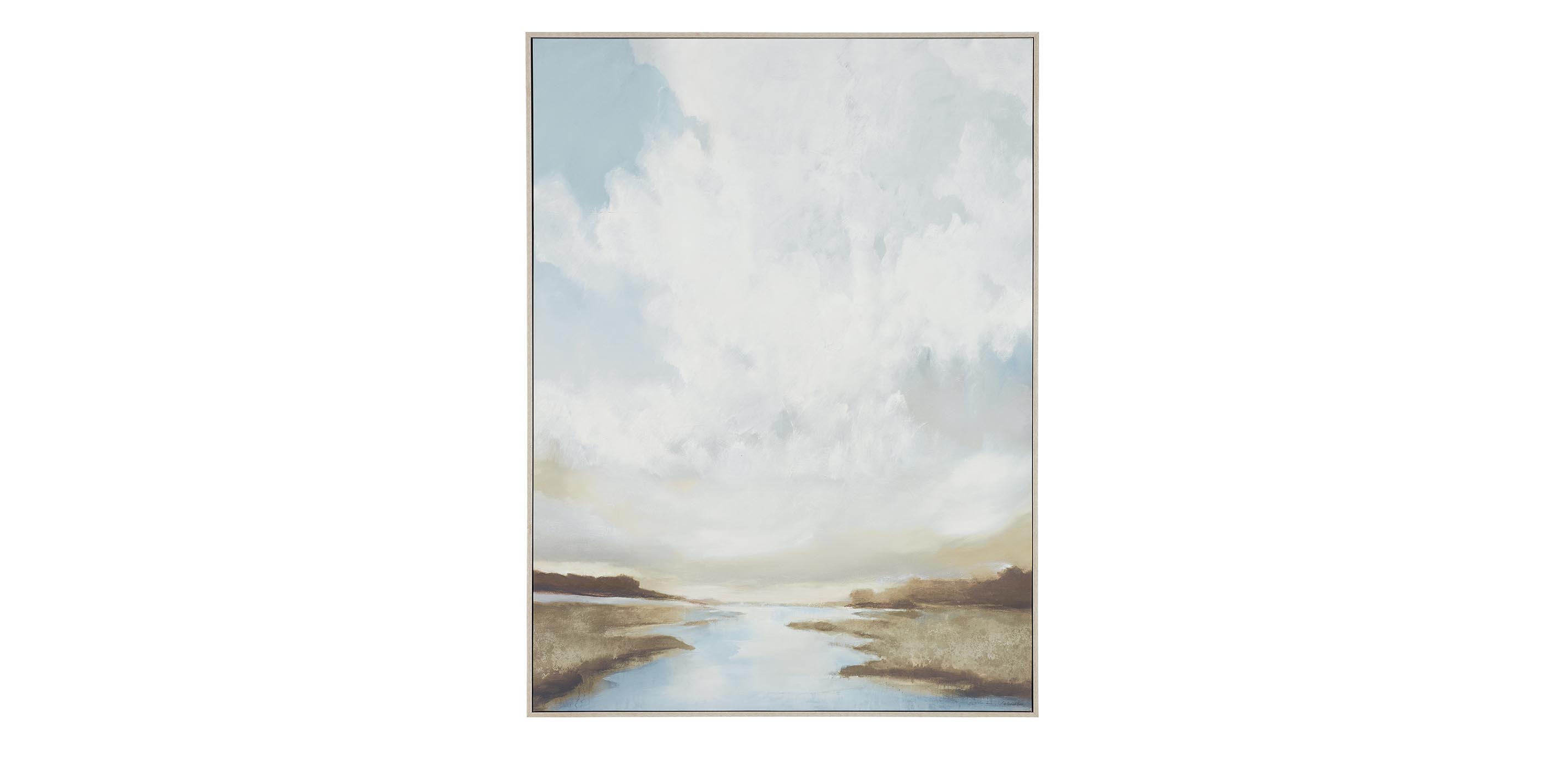 Pause for a moment to gaze on this tranquil landscape where land and water meander toward the horizon. The artist's use of one-point perspective and a grand cloudscape draw eyes forward, creating a sense of anticipation as if waiting for the sun to rise. Hung in casual or formal spaces, this piece projects a feeling of serenity.