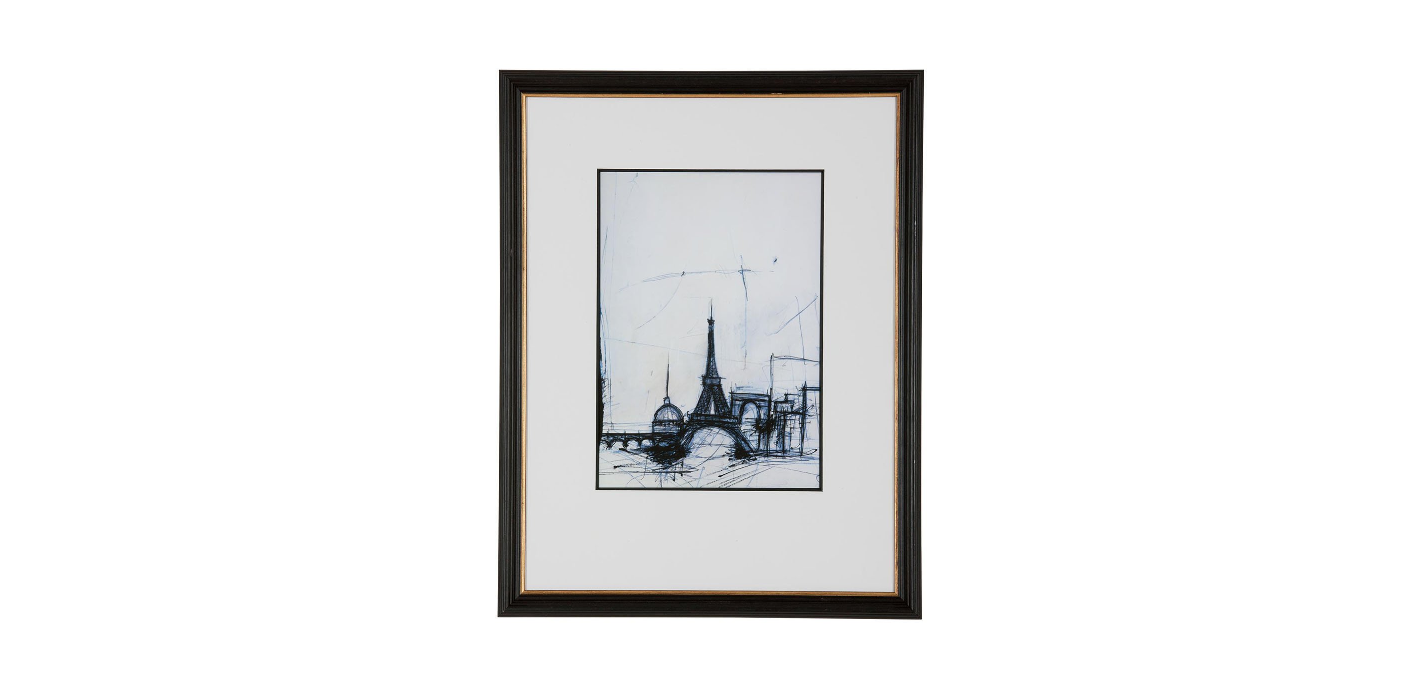 With its clean strokes, this Paris Eiffel Tower print of a sketch by artist Checo Diego will take you across the Atlantic, where artists sit on Champ du Mars and sketch Eiffel Tower drawings into their notebooks. Artisans re-create this Eiffel Tower print in giclée on watercolor paper, mat it, and embellish it with a decorative black filled before framing it by hand in gold and black. Display alone or with its companion piece depicting the Eiffel Tower, You Are Here l.
