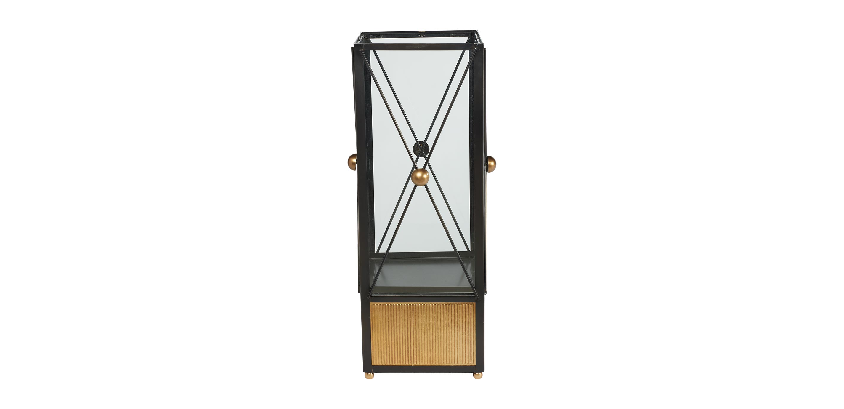 Crafted from steel with a black powder-coated finish—which means they're suited for both indoor and outdoor use—our Breckett metal hurricanes get additional glimmer from painted brass details. Use them as sculptural centerpieces by day or bathe nighttime gatherings in the soft glow of candlelight.