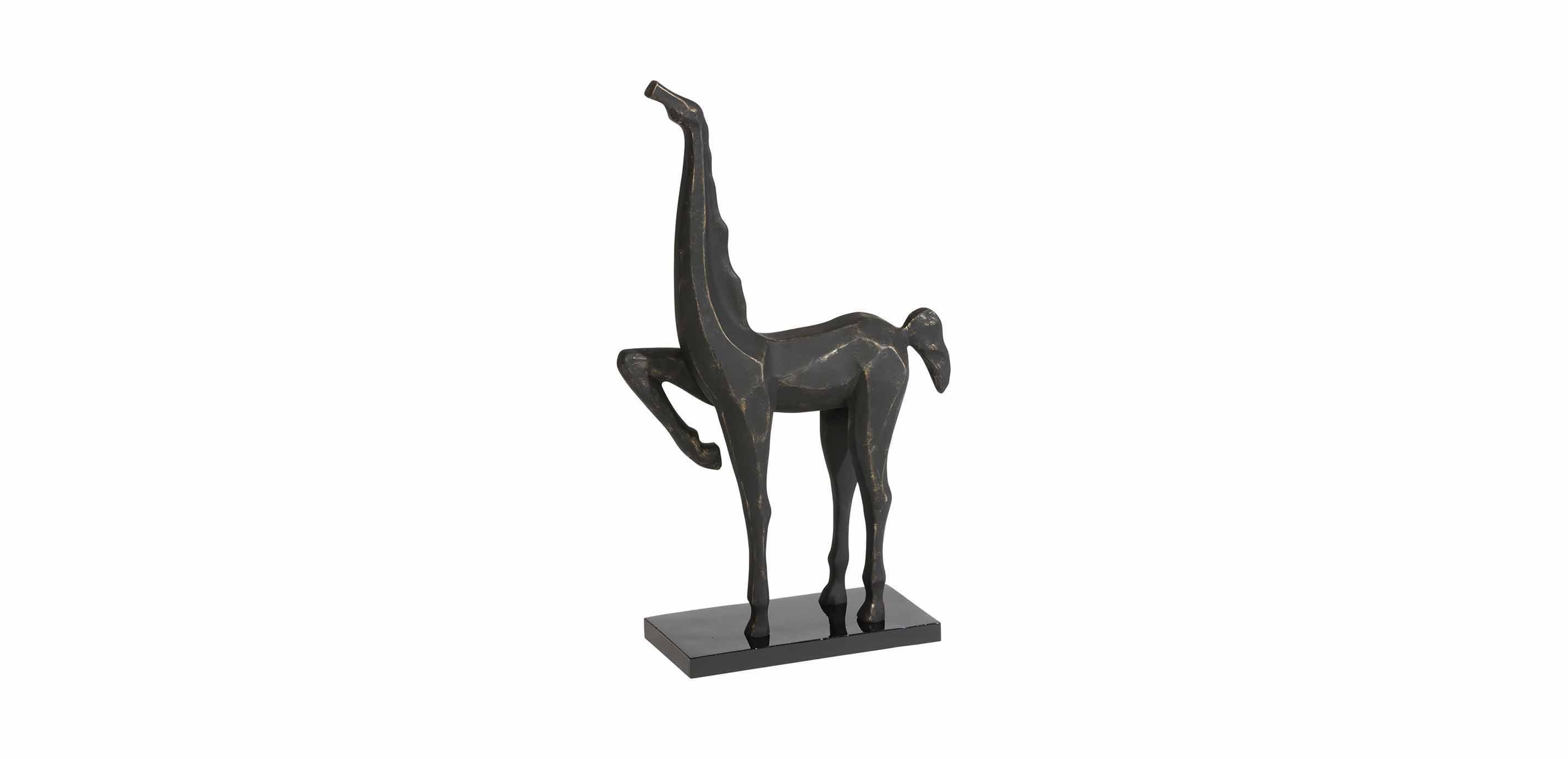 Form is open to interpretation with this cubist-inspired horse art sculpture. The horse sculpture's long limbs and neck communicate grace and swiftness. The upturned face and stamping hoof add a strong sense of motion. And the midcentury aesthetic or this elegant horse décor brings the outdoors in.