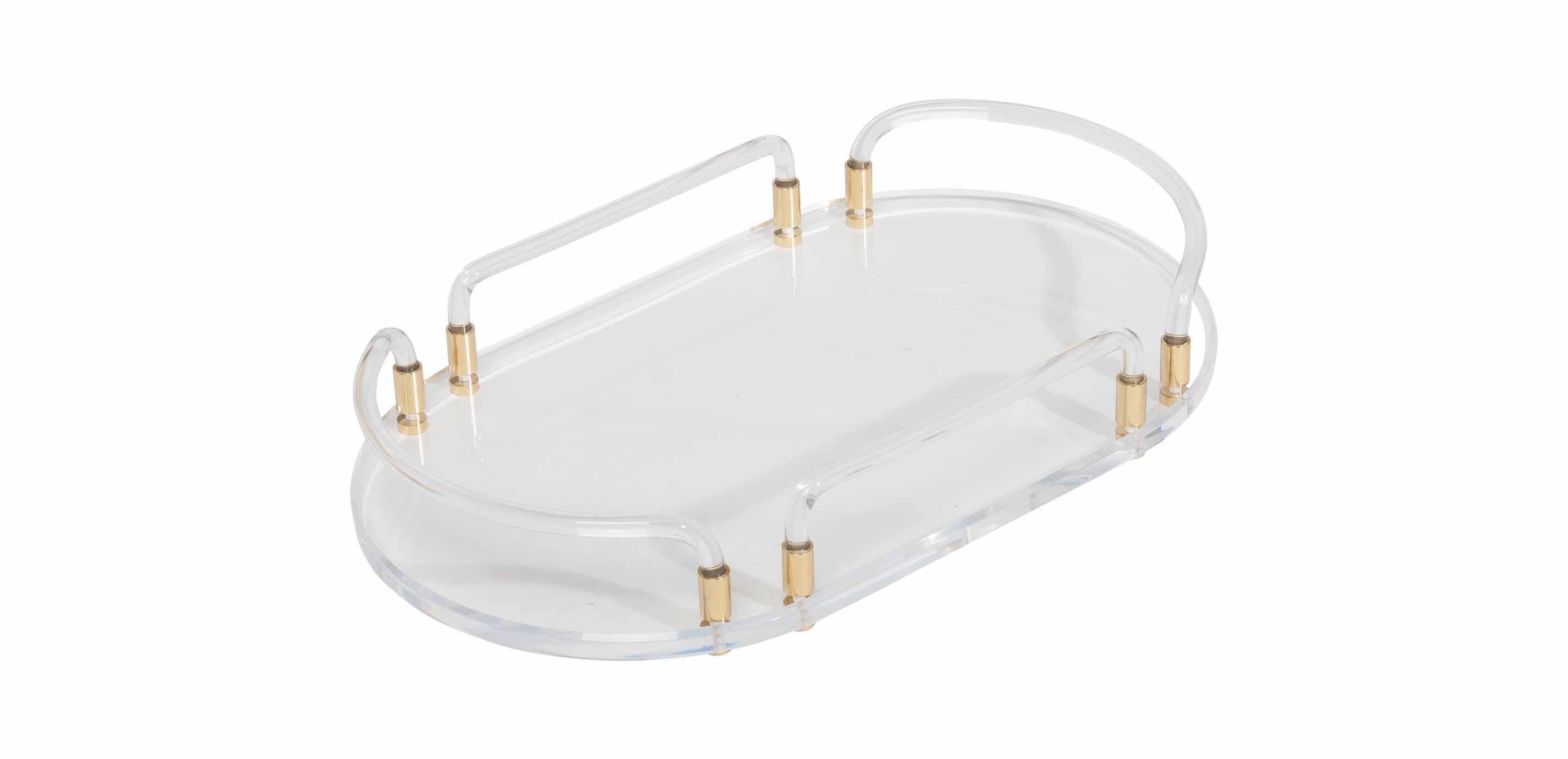 Our Collette decorative accent tray is made with care, from its curvy acrylic side rails (which are patiently bent by hand) to its carefully crafted brass fittings. The result is a shining décor tray stage for displaying pretty, collected pieces or turning personal items into miniature works of art.