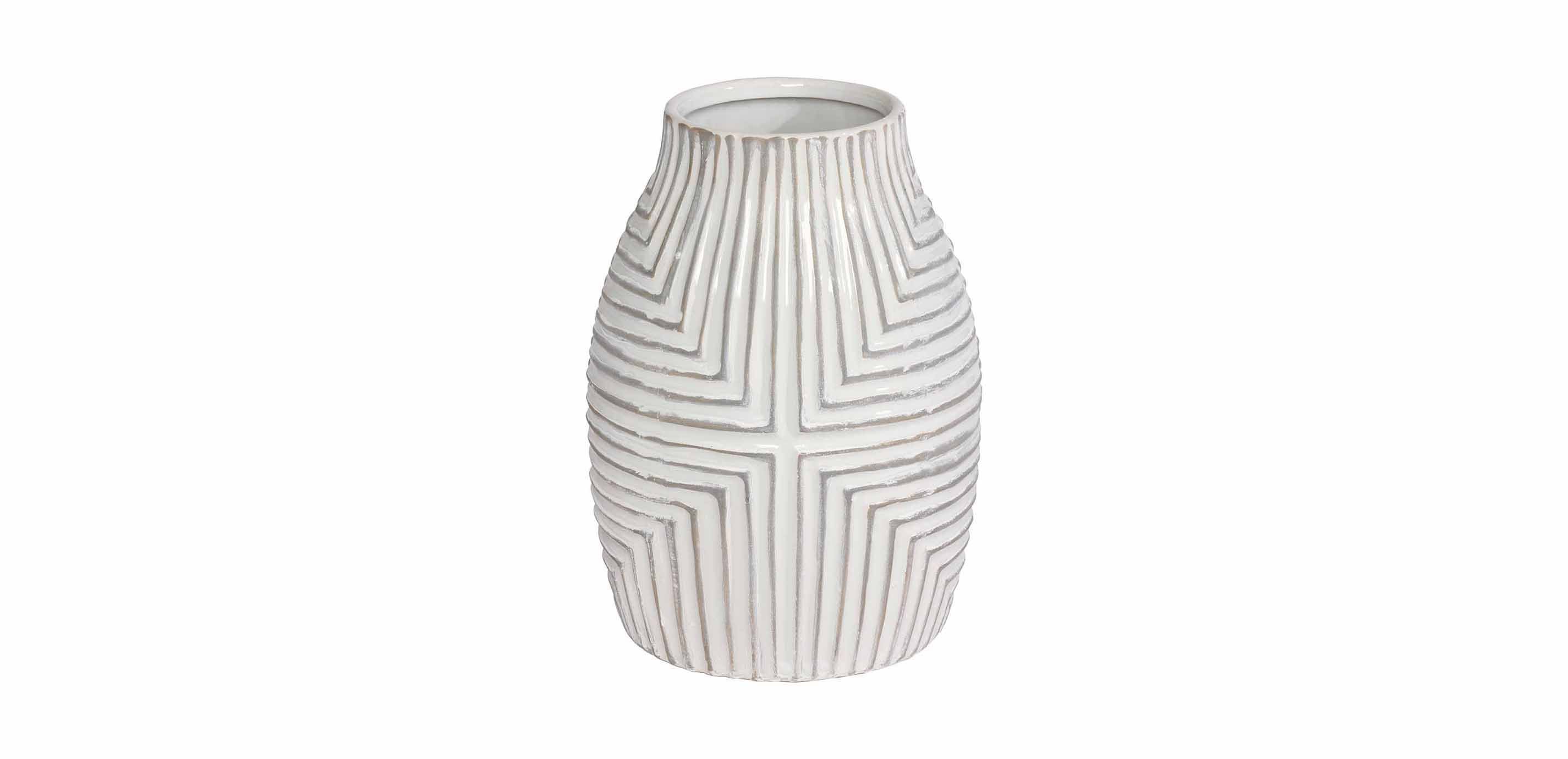 Pattern and texture come into play in our trio of Aztec vases. Group all three together or select one as a special accent, their cool white glaze is at home in almost any tabletop, sideboard, or mantel display.