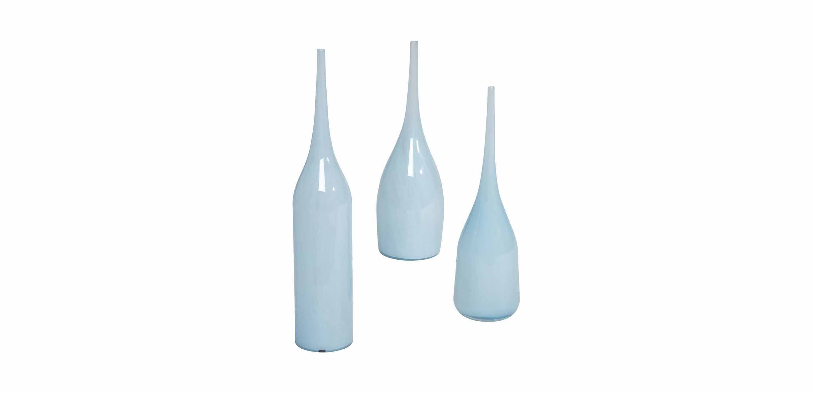 Mouth-blown glass vases like our Blue Glass Goddess vases have been crafted in Northern China for generations, by families who pass down the artisanal techniques they learned from their forebears. Each decorative blue vase is heavy and dense, crafted from 100% colored glass. Display them in pairs, or threes or more; they look enchanting next to our white Goddess vases as well. Each vase, ranging in height from 14 to 22 inches, is rounded at the base and tapered at the top.
