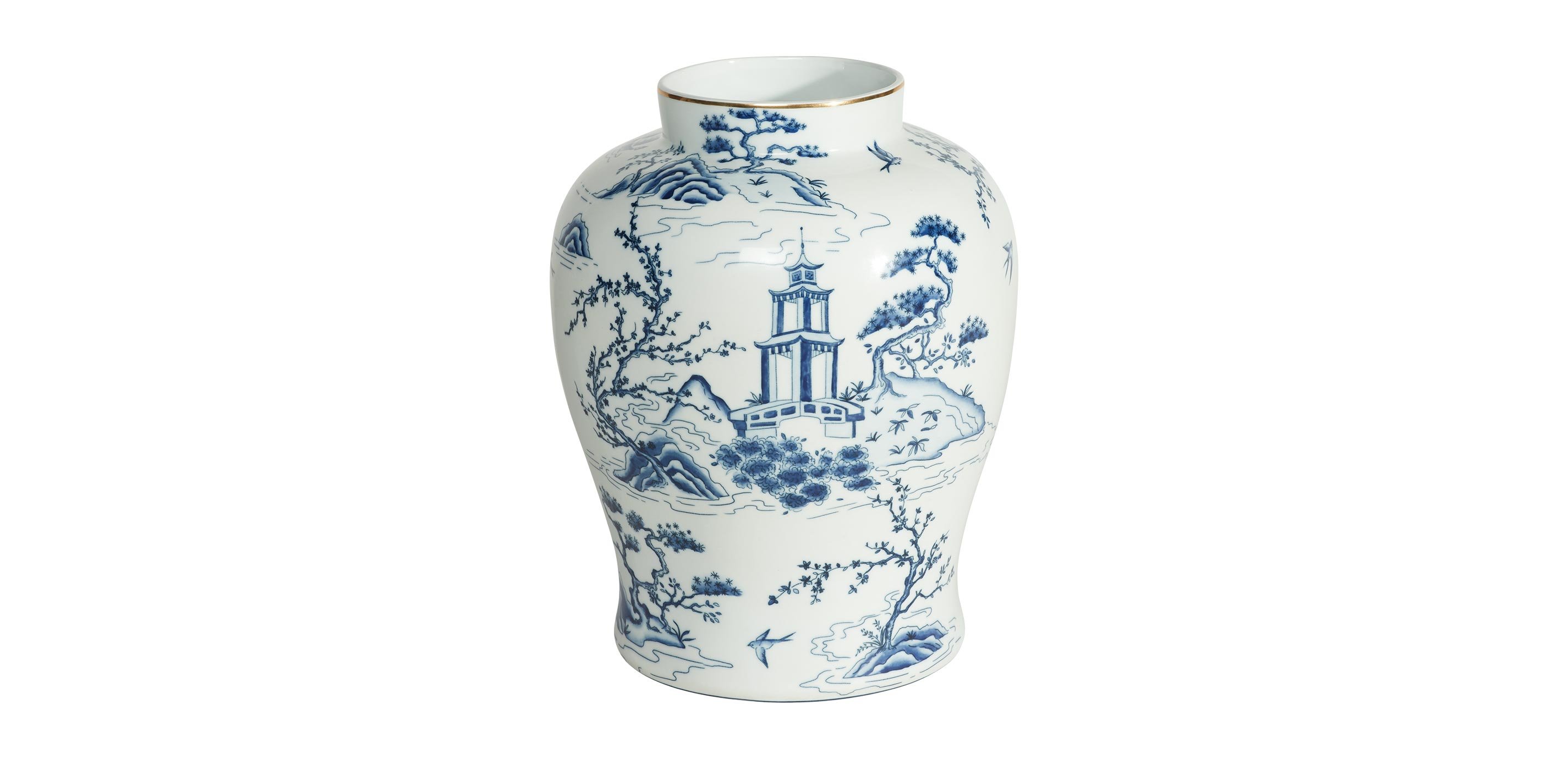 Every brushstroke tells a story on our Chinoiserie Scene vase, where nature-inspired motifs lead your eye toward the serenity of the pagoda. A delicate gold-painted rim elegantly caps off the scene.