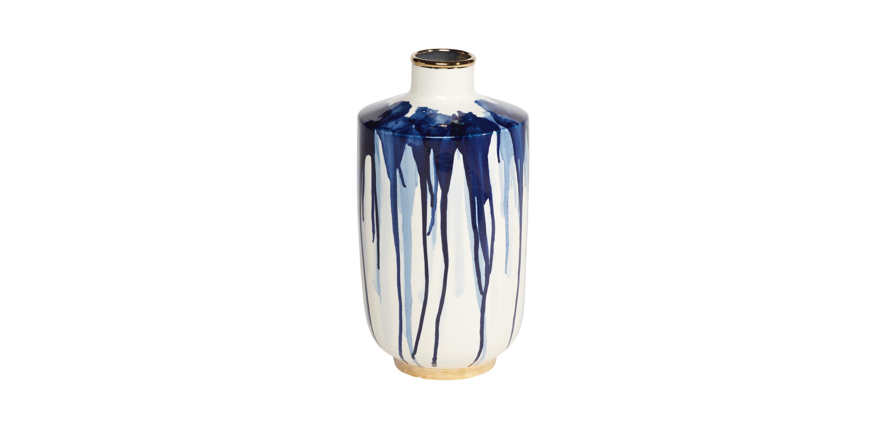 A casual, layered blue drip glaze gives our Danya vases instant visual pop. Gold electroplate detail around the rim and base up their elegance factor; they have a way of instantly dressing up any space.