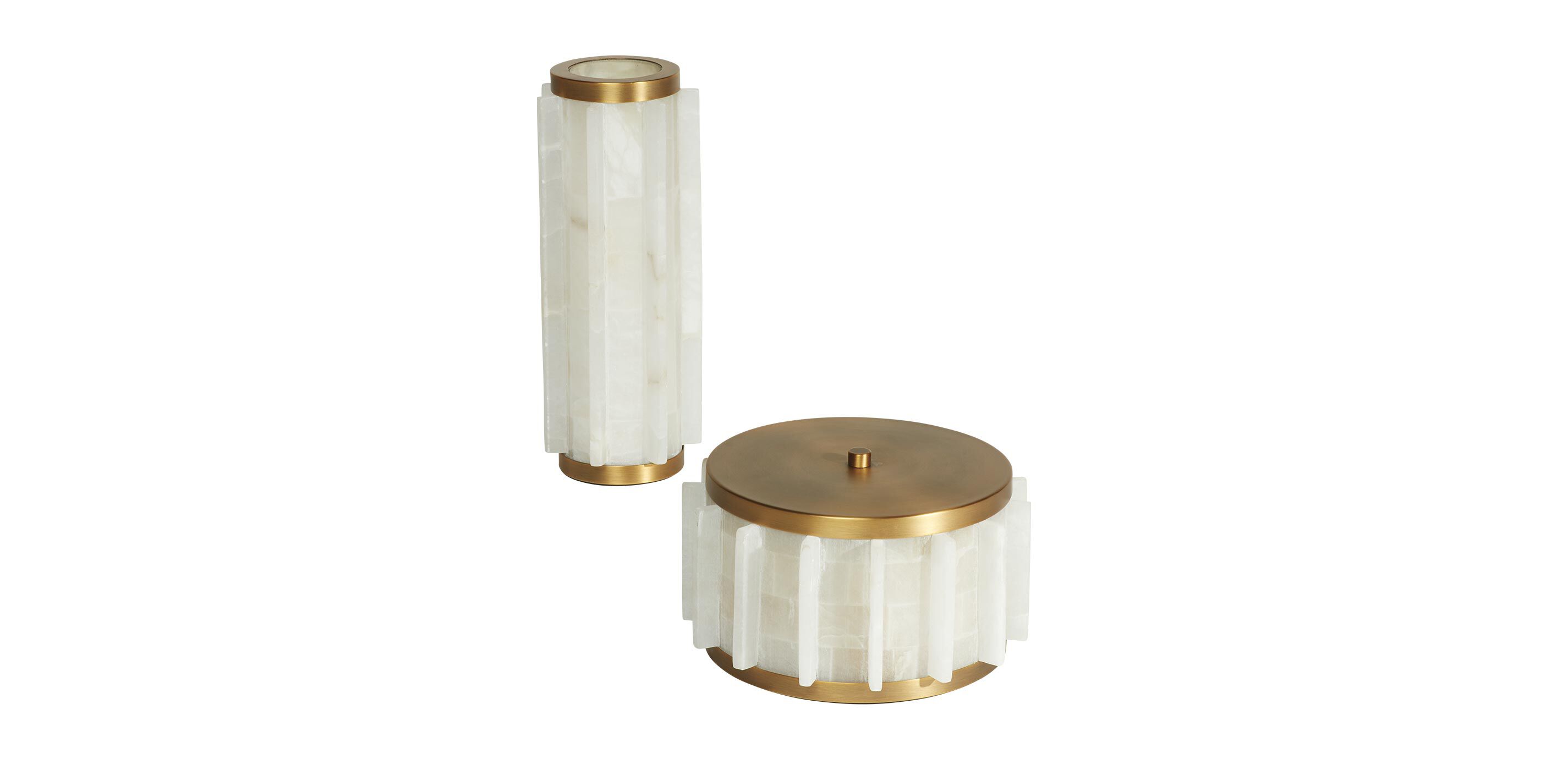 We've taken the polished and hand-fitted frames of our Farida alabaster lighting and reimagined them in the forms of this stunning jar and vase. Hand-brushed brass caps adorn the top and base; because every stone is chosen by hand, no two are alike.