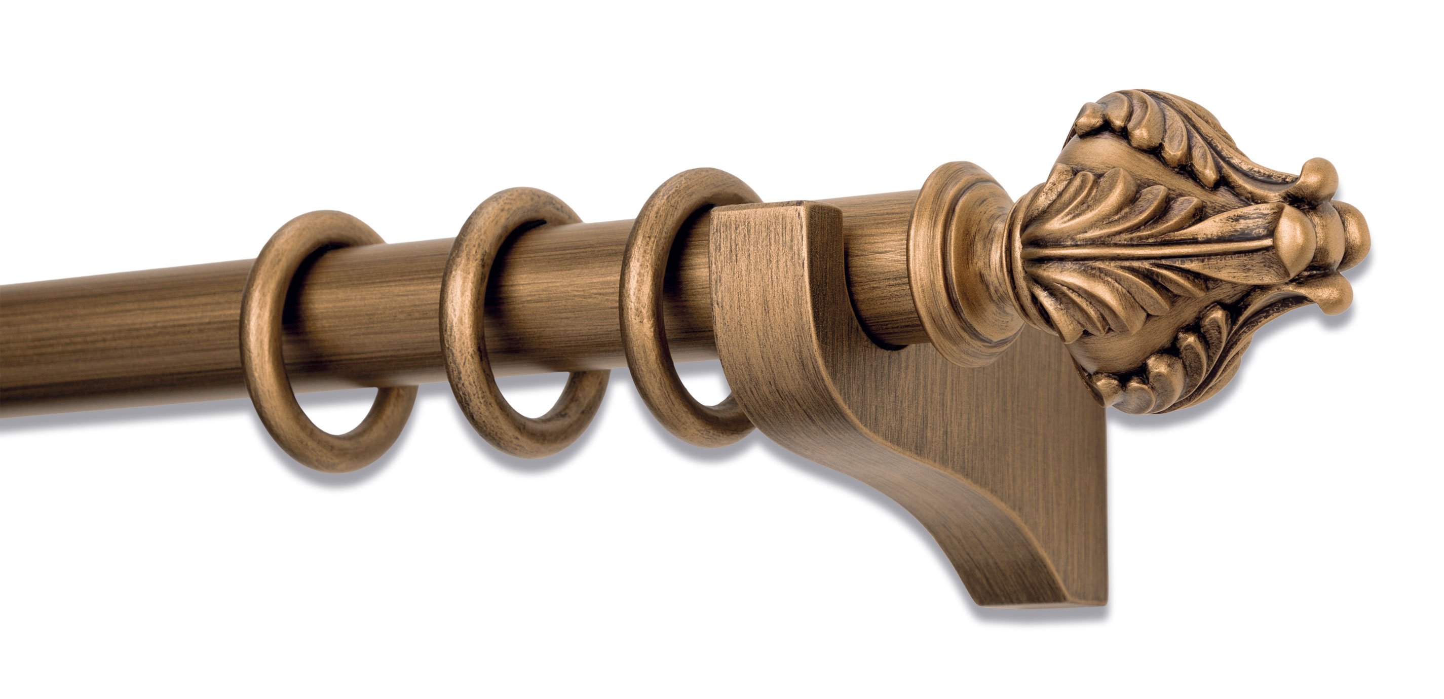 - 6' drapery hardware set includes one pair of finials, a 6' drapery pole, 28 rings, and three support brackets with a 3" projection