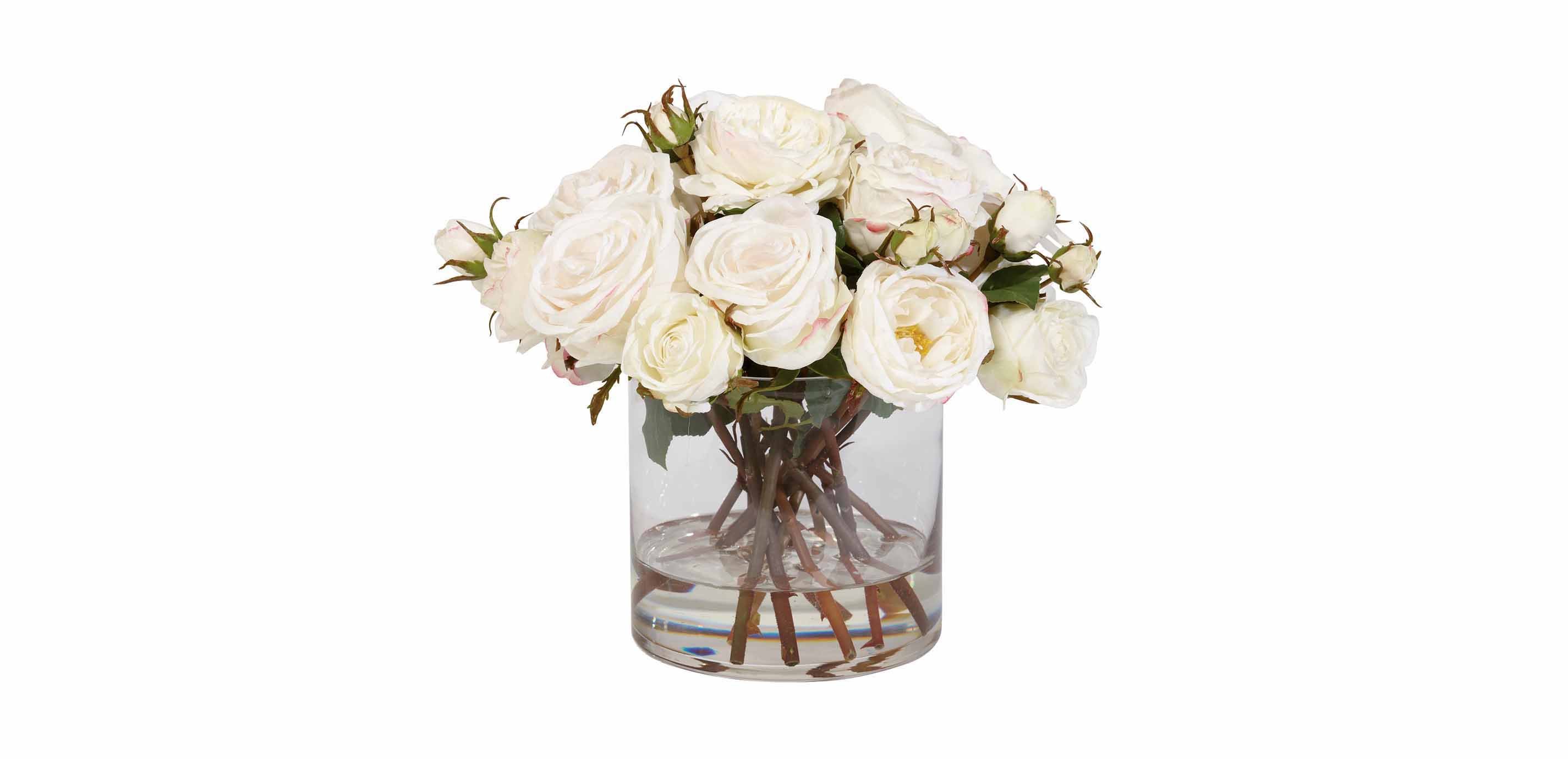 A bunch of blooming roses makes a stunning display. Blunt-cut stems are arranged in a round glass cylinder for a classic touch of natural beauty.