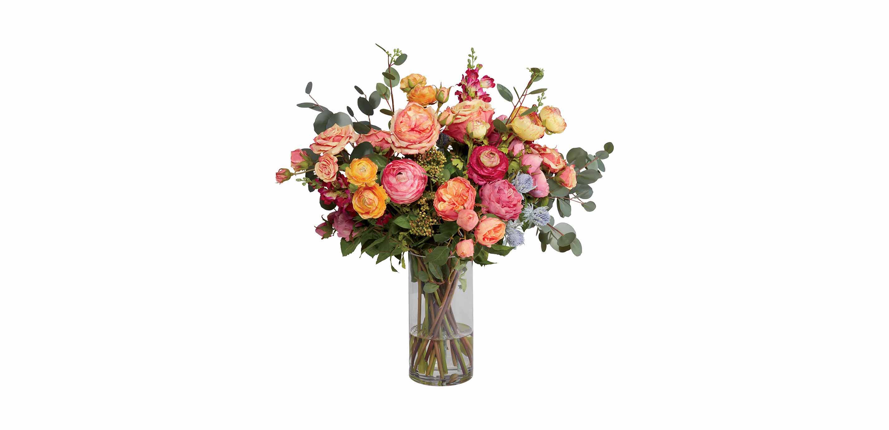 Living color, with the ease of faux maintenance. This blend of bright ranunculus and vibrant roses is colorfully contemporary, yet its classic composition gives it a vintage, almost Victorian feel. So romantic!