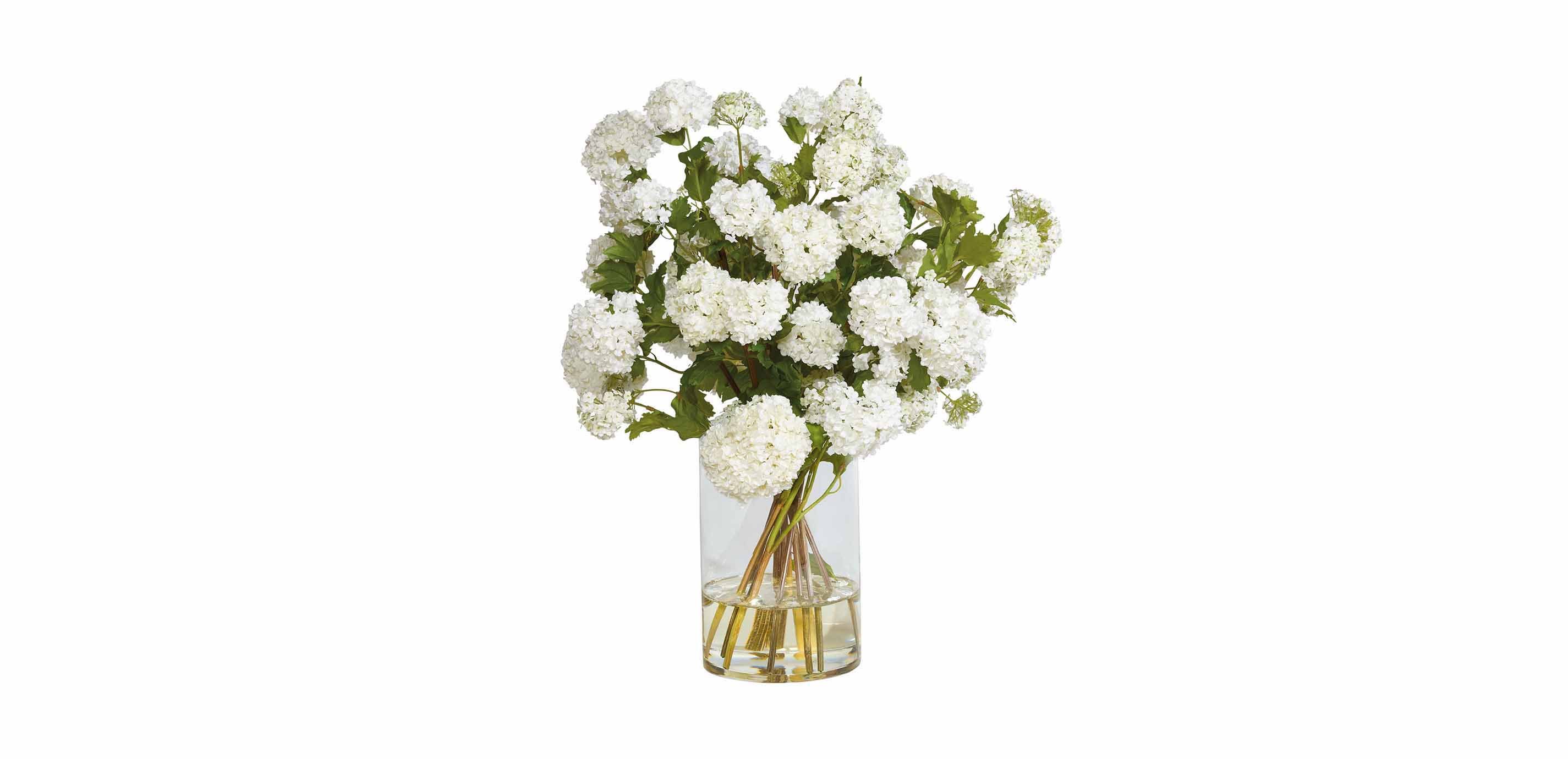 Handcrafted for year-round elegance, there's no watering required to maintain the stunning good looks of this snowball water garden. With dense flowers, it makes for a sumptuous display; it's set in a glass cylinder with acrylic "water" that adds to its lifelike beauty.