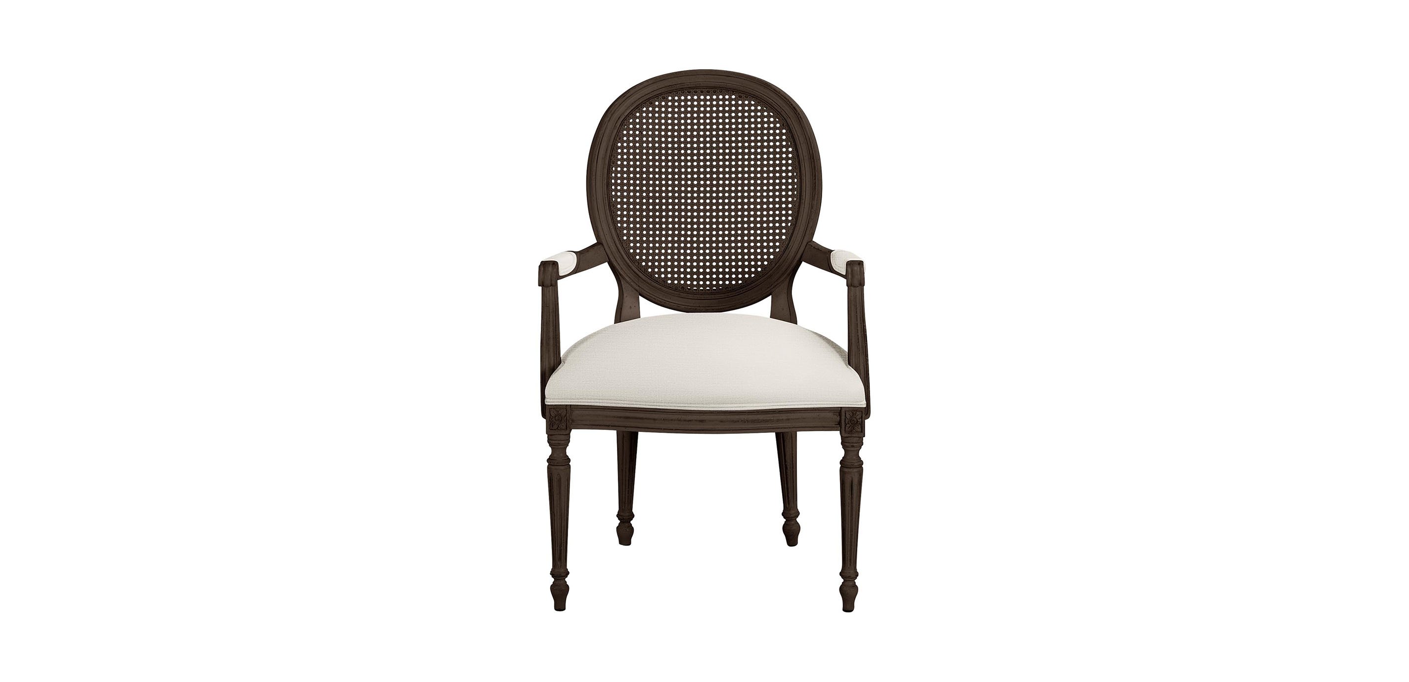 Refined without ruffles. You'll be sitting pretty on this French-inspired chair. The cane back gives the piece an air of lightness. To bring in a garden feeling, you might choose to have the cane hand-painted with a lattice pattern. With exquisite hand-detailing and double-welting.