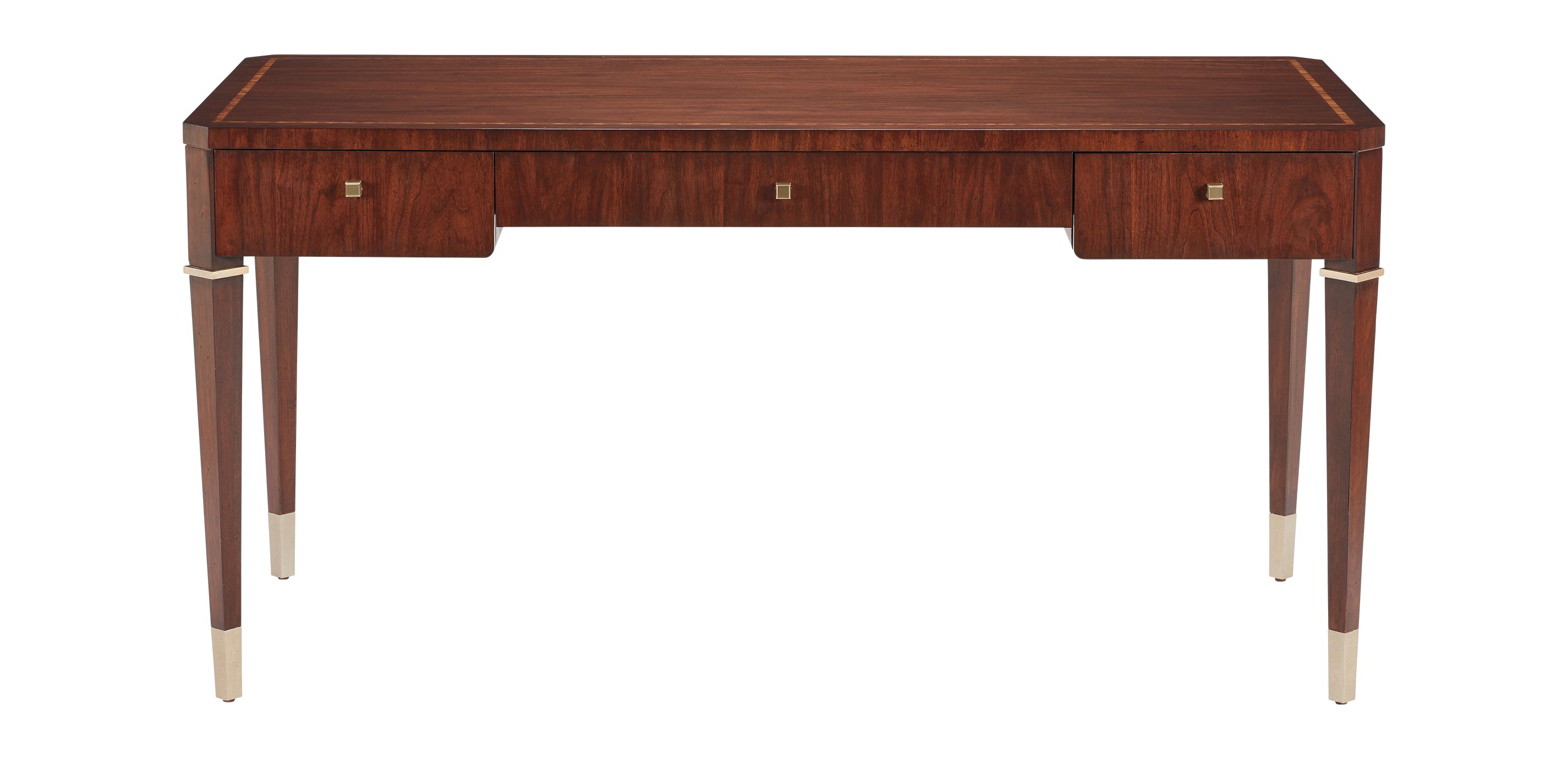 Designed with Duncan Phyfe furniture in mind, then proportioned for modern functionality, the Lloyd desk is equal parts stylish and practical. Its tapered legs are trimmed with hand-painted gold-toned collars, plus ferrules finished in Satin Gold. Three drawers add useful storage while a primavera inlay adds beauty to its wood veneer top.