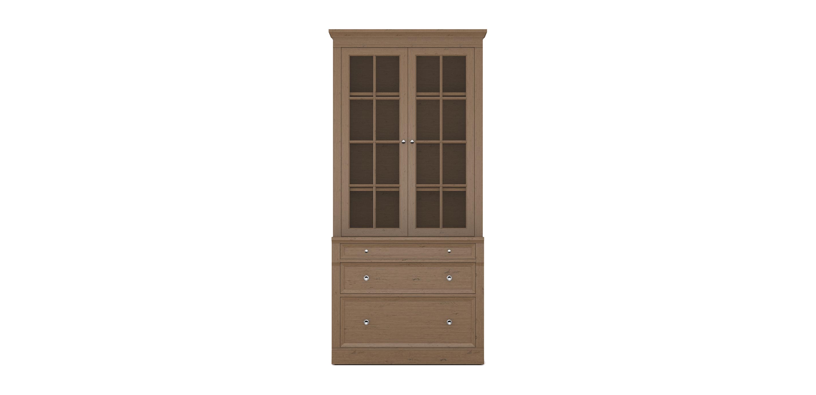 Hardworking file cabinet below, stylish glass-door cabinet above—this storage sensation offers room for files plus ample display space for favorite keepsakes and awards. Customizable in your choice of wood and hardware finish and versatile enough to use outside your office, too.