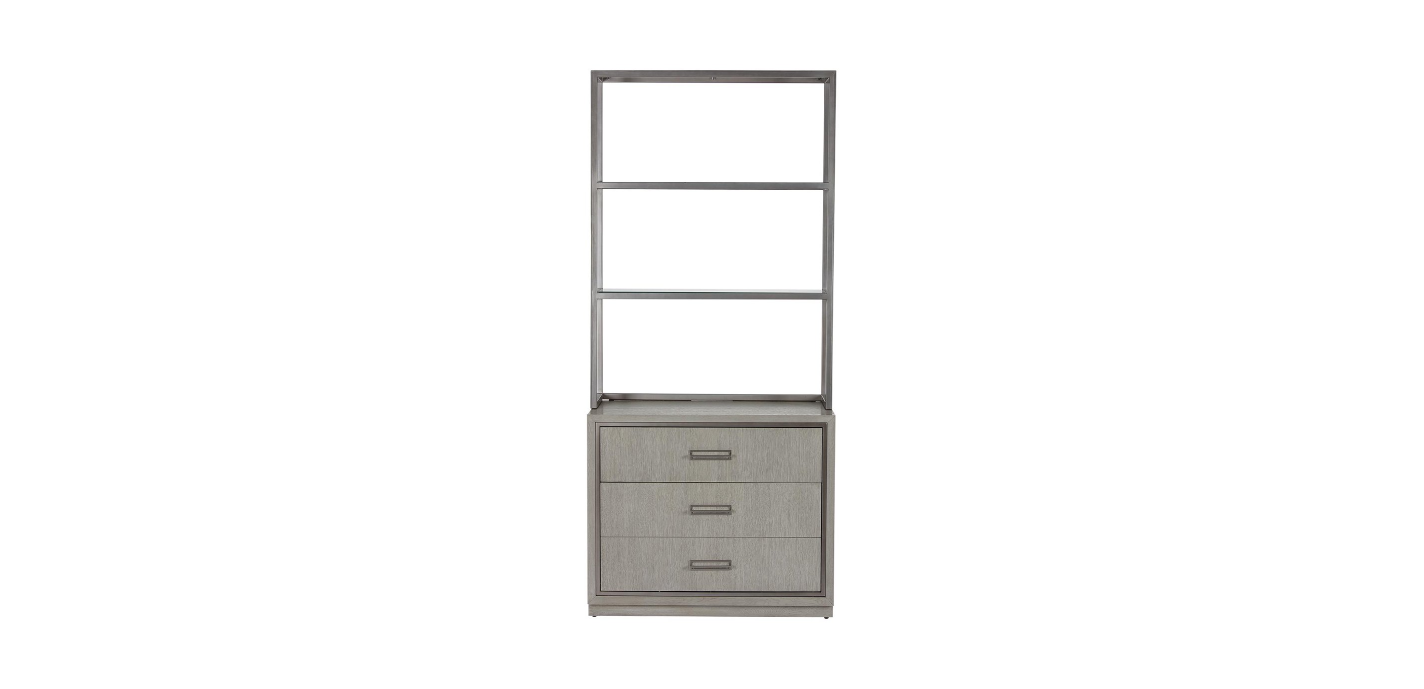 - Hutch is crafted from steel, with a satin nickel finish, and has three tempered glass shelves for open storage