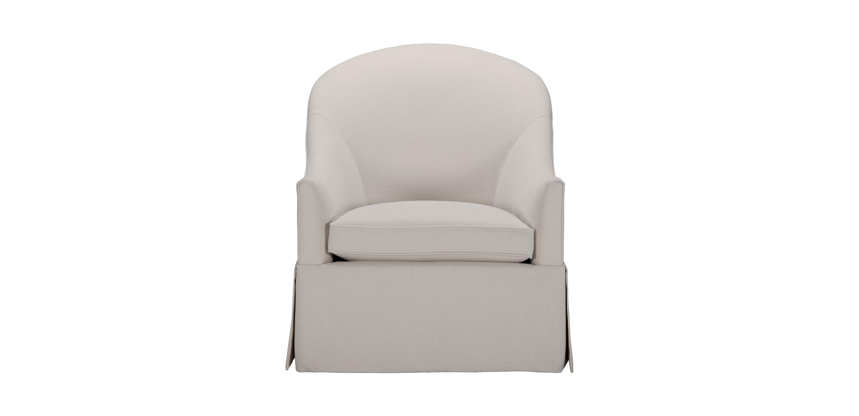 - This petite barrel swivel chair features a tight back, loose welted seat cushion, and swooping low arms