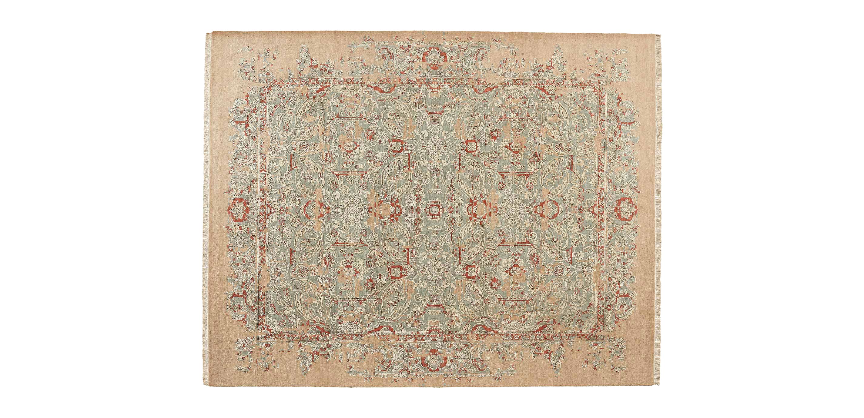 Our Nila Antiqued Rug features a traditional pattern with a modern twist: a deconstructed design in an elegant mix of wool and spun silk. Beautiful mineral-toned blues and unexpected pops of Nantucket red infuse its raised pattern, allowing the exquisite details to shine in any setting.